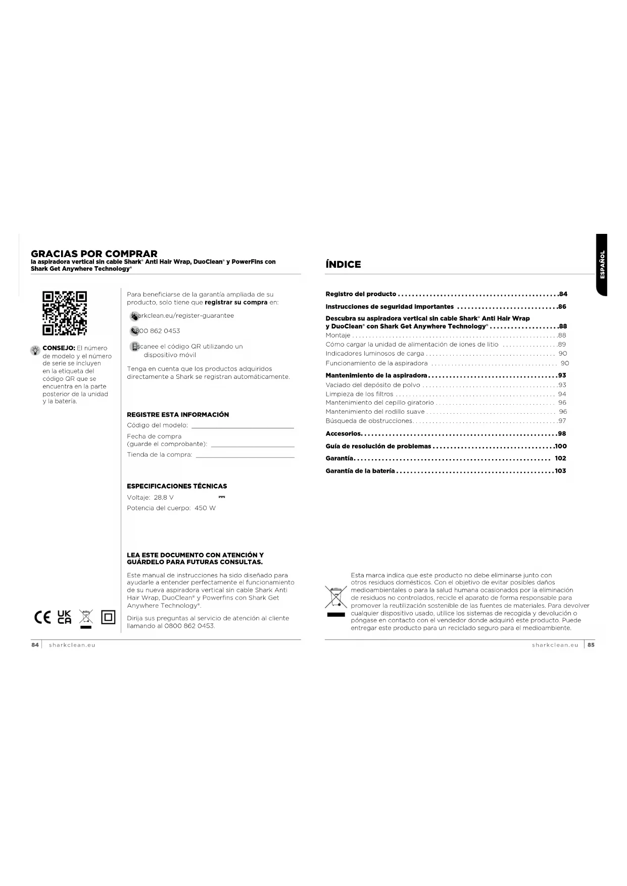 - Garantía de la batería LEA ESTE DOCUMENTO CON ATENCIÓN Y GUÁRDELO PARA FUTURAS CONSULTAS. Este manual de instrucciones ha sido diseñado para ayudarle a entender perfectamente el funcionamiento de su nueva aspiradora vertical sin cable Shark Anti Hair Wrap, DuoClean® y Powerfins con Shark Get Anywhere Technology®. Dirija sus preguntas al servicio de atención al cliente llamando al 0800 862 0453. p. 103