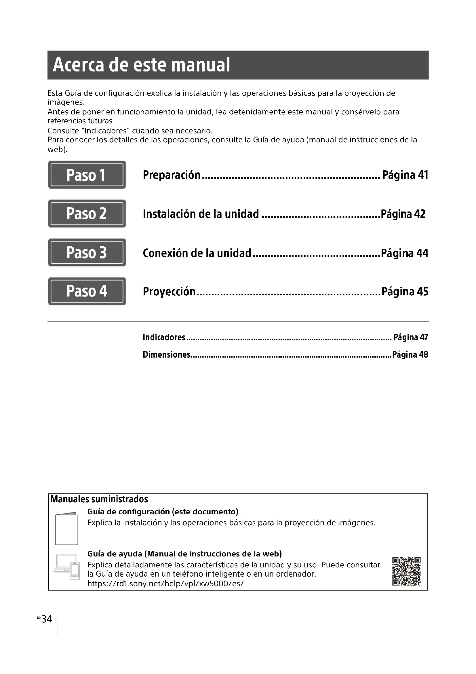 Esta Guía de configuración explica la instalación y las operaciones básicas para la proyección de imágenes.Antes de poner en funcionamiento la unidad, lea detenidamente este manual y consérvelo para referencias futuras.Consulte “Indicadores” cuando sea necesario.Para conocer los detalles de las operaciones, consulte la G ía de ayuda (manual de instrucciones de la web). Acerca de este manual Preparación............................................................ Página 41 Instalación de la unidad ........................................Página 42 Conexión de la unidad ...........................................Página 44 Proyección ..............................................................Página 45 Indicadores............................................................................................ Página 47 Dimensiones..........................................................................................Página 48 Paso 1 Paso 2 Paso 3 Paso 4 Manuales suministrados Guía de configuración (este documento)Explica la instalación y las operaciones básicas para la proyección de imágenes.Guía de ayuda (Manual de instrucciones de la web)Explica detalladamente las características de la unidad y su uso. Puede consultar la Guía de ayuda en un teléfono inteligente o en un ordenador.https://rd1.sony.net/help/vpl/xw5000/es/35