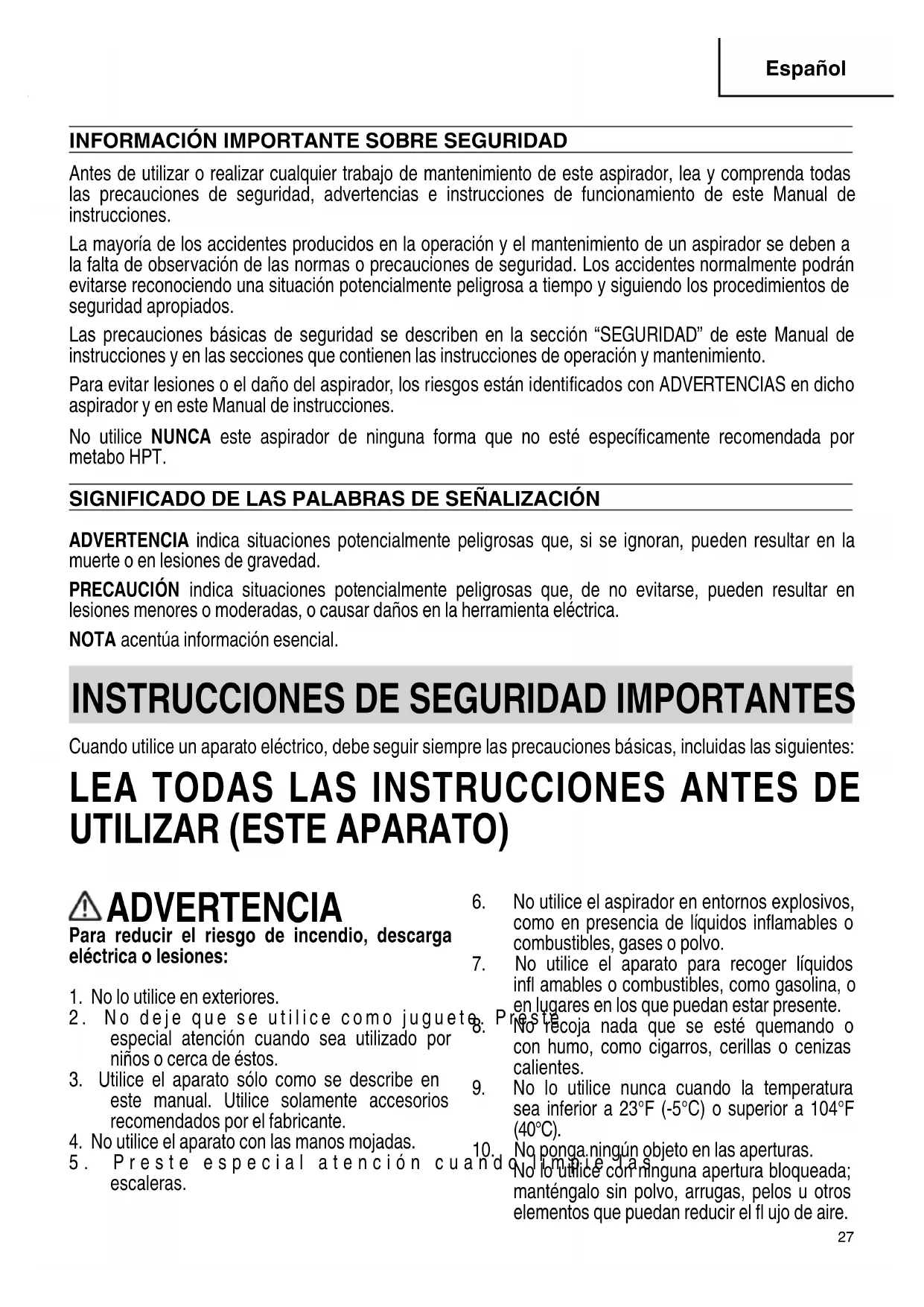 Français 000BookR18DLUS.indb26000BookR18DLUS.indb26 2018/10/2414:20:562018/10/2414:20:56INFORMACIÓN IMPORTANTE SOBRE SEGURIDAD Antes de utilizar o realizar cualquier trabajo de mantenimiento de este aspirador, lea y comprenda todas las precauciones de seguridad, advertencias e instrucciones de funcionamiento de este Manual de instrucciones. La mayoría de los accidentes producidos en la operación y el mantenimiento de un aspirador se deben a la falta de observación de las normas o precauciones de seguridad. Los accidentes normalmente podrán evitarse reconociendo una situación potencialmente peligrosa a tiempo y siguiendo los procedimientos de seguridad apropiados. Las precauciones básicas de seguridad se describen en la sección “SEGURIDAD” de este Manual de instrucciones y en las secciones que contienen las instrucciones de operación y mantenimiento. Para evitar lesiones o el daño del aspirador, los riesgos están identifi cados con ADVERTENCIAS en dicho aspirador y en este Manual de instrucciones. No utilice NUNCA este aspirador de ninguna forma que no esté específi camente recomendada por metabo HPT. SIGNIFICADO DE LAS PALABRAS DE SEÑALIZACIÓN ADVERTENCIA indica situaciones potencialmente peligrosas que, si se ignoran, pueden resultar en la muerte o en lesiones de gravedad. PRECAUCIÓN indica situaciones potencialmente peligrosas que, de no evitarse, pueden resultar en lesiones menores o moderadas, o causar daños en la herramienta eléctrica. NOTA acentúa información esencial.