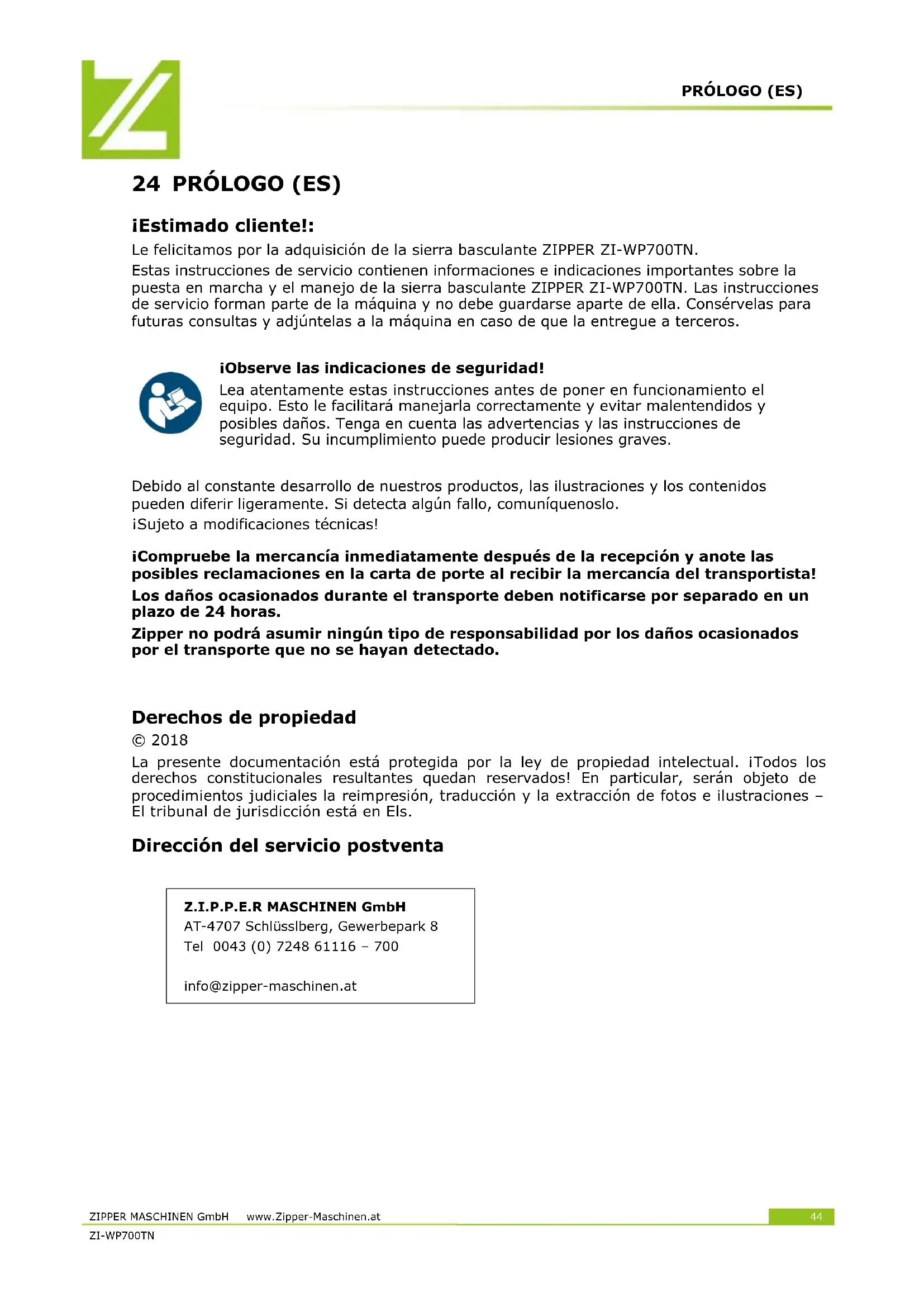 - PRÓLOGO (ES) ZIPPER MASCHINEN GmbH www.Zipper-Maschinen.at 44 ZI-WP700TN 24 PRÓLOGO (ES) ¡Estimado cliente!: Le felicitamos por la adquisición de la sierra basculante ZIPPER ZI-WP700TN. Estas instrucciones de servicio contienen informaciones e indicaciones importantes sobre la puesta en marcha y el manejo de la sierra basculante ZIPPER ZI-WP700TN. Las instrucciones de servicio forman parte de la máquina y no debe guardarse aparte de ella. Consérvelas para futuras consultas y adjúntelas a la máquina en caso de que la entregue a terceros.