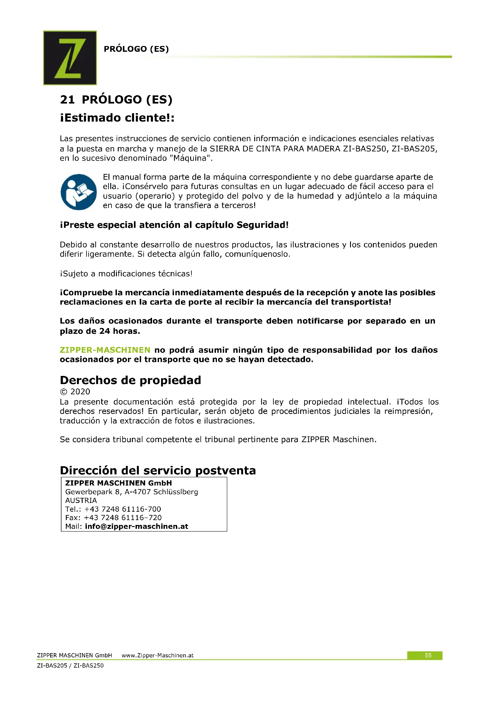 according to the operating instructionsPRÓLOGO (ES) ZIPPER MASCHINEN GmbH www.Zipper-Maschinen.at 55 ZI-BAS205 / ZI-BAS25055 21 PRÓLOGO (ES) ¡Estimado cliente!: Las presentes instrucciones de servicio contienen información e indicaciones esenciales relativas a la puesta en marcha y manejo de la SIERRA DE CINTA PARA MADERA ZI-BAS250, ZI-BAS205, en lo sucesivo denominado "Máquina". El manual forma parte de la máquina correspondiente y no debe guardarse aparte de ella. ¡Consérvelo para futuras consultas en un lugar adecuado de fácil acceso para el usuario (operario) y protegido del polvo y de la humedad y adjúntelo a la máquina en caso de que la transfiera a terceros! ¡Preste especial atención al capítulo Seguridad! Debido al constante desarrollo de nuestros productos, las ilustraciones y los contenidos pueden diferir ligeramente. Si detecta algún fallo, comuníquenoslo. ¡Sujeto a modificaciones técnicas! ¡Compruebe la mercancía inmediatamente después de la recepción y anote las posibles reclamaciones en la carta de porte al recibir la mercancía del transportista! Los daños ocasionados durante el transporte deben notificarse por separado en un plazo de 24 horas. ZIPPER-MASCHINEN no podrá asumir ningún tipo de responsabilidad por los daños ocasionados por el transporte que no se hayan detectado. Derechos de propiedad © 2020 La presente documentación está protegida por la ley de propiedad intelectual. ¡Todos los derechos reservados! En particular, serán objeto de procedimientos judiciales la reimpresión, traducción y la extracción de fotos e ilustraciones. Se considera tribunal competente el tribunal pertinente para ZIPPER Maschinen.