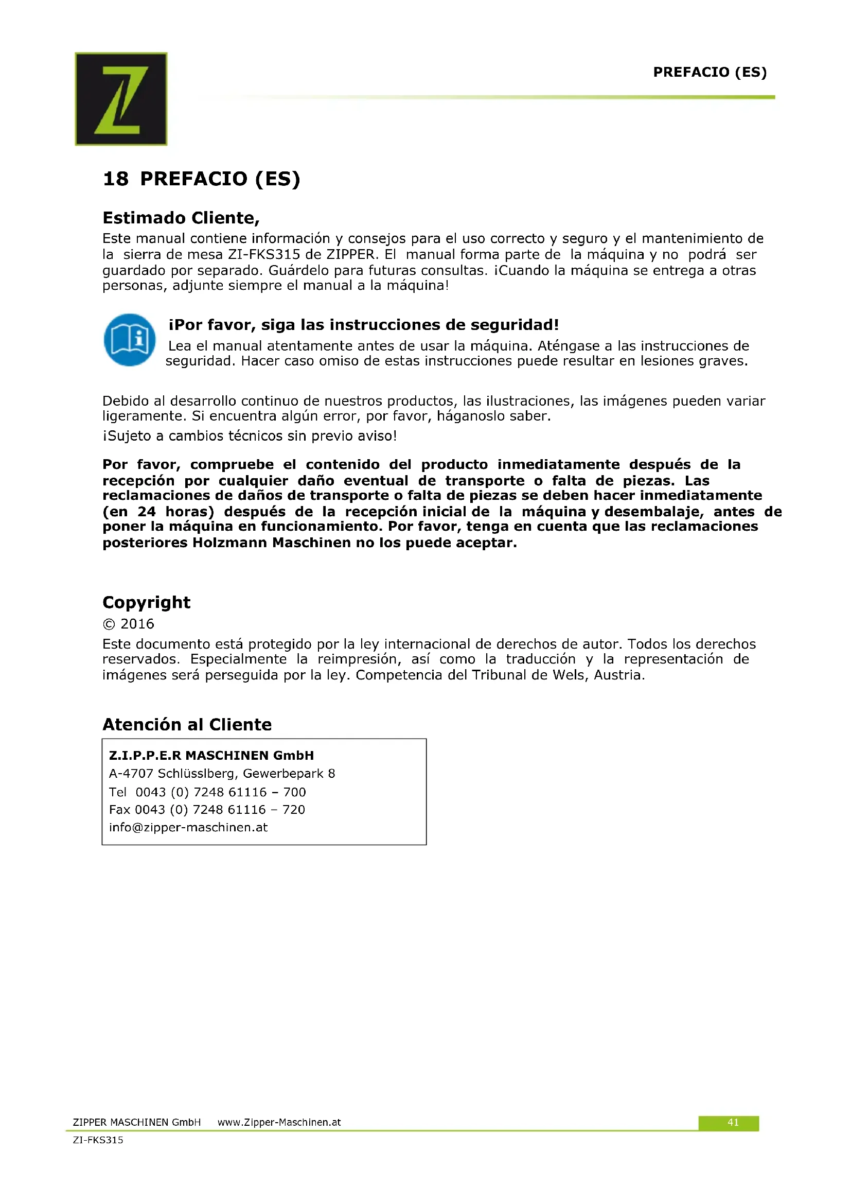 Should you in necessary repairs not able to properly to perform or you have not the prescribed training for it always attract a workshop to fix the problem.PREFACIO (ES) ZIPPER MASCHINEN GmbH www.Zipper-Maschinen.at 41 ZI-FKS315 18 PREFACIO (ES) Estimado Cliente, Este manual contiene información y consejos para el uso correcto y seguro y el mantenimiento de la sierra de mesa ZI-FKS315 de ZIPPER. El manual forma parte de la máquina y no podrá ser guardado por separado. Guárdelo para futuras consultas. ¡Cuando la máquina se entrega a otras personas, adjunte siempre el manual a la máquina! ¡Por favor, siga las instrucciones de seguridad! Lea el manual atentamente antes de usar la máquina. Aténgase a las instrucciones de seguridad. Hacer caso omiso de estas instrucciones puede resultar en lesiones graves. Debido al desarrollo continuo de nuestros productos, las ilustraciones, las imágenes pueden variar ligeramente. Si encuentra algún error, por favor, háganoslo saber. ¡Sujeto a cambios técnicos sin previo aviso! Por favor, compruebe el contenido del producto inmediatamente después de la recepción por cualquier daño eventual de transporte o falta de piezas. Las reclamaciones de daños de transporte o falta de piezas se deben hacer inmediatamente (en 24 horas) después de la recepción inicial de la máquina y desembalaje, antes de poner la máquina en funcionamiento. Por favor, tenga en cuenta que las reclamaciones posteriores Holzmann Maschinen no los puede aceptar.