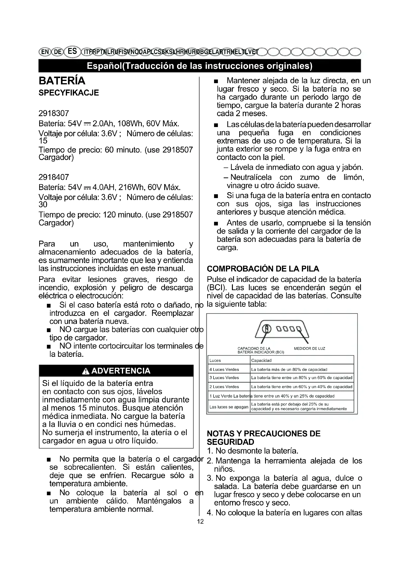 - Use solamente baterías recargables de ion-litio 2918307 / 2918407. ELIMINACIÓN SEGURA DE LA BATERÍA Las baterías utilizadas en esta herramienta contienen los siguientes materiales tóxicos y corrosivos: Litio-ión, un material tóxico. ADVERTENCIA Todos los materiales tóxicos deben ser desechados de forma especíca para evitar contaminar el medio ambiente. Antes de desechar una batería de litio- ión estropeada o gastada, póngase en contacto con el organismo encargado del tratamiento de residuos más próximo o con su agencia de protección medioambiental para informarse y solicitar instrucciones especícas. Recicle las baterías en un centro o dispositivo adecuado, autorizado para el tratamiento de ión-litio.Español(Traducción de las instrucciones originales)