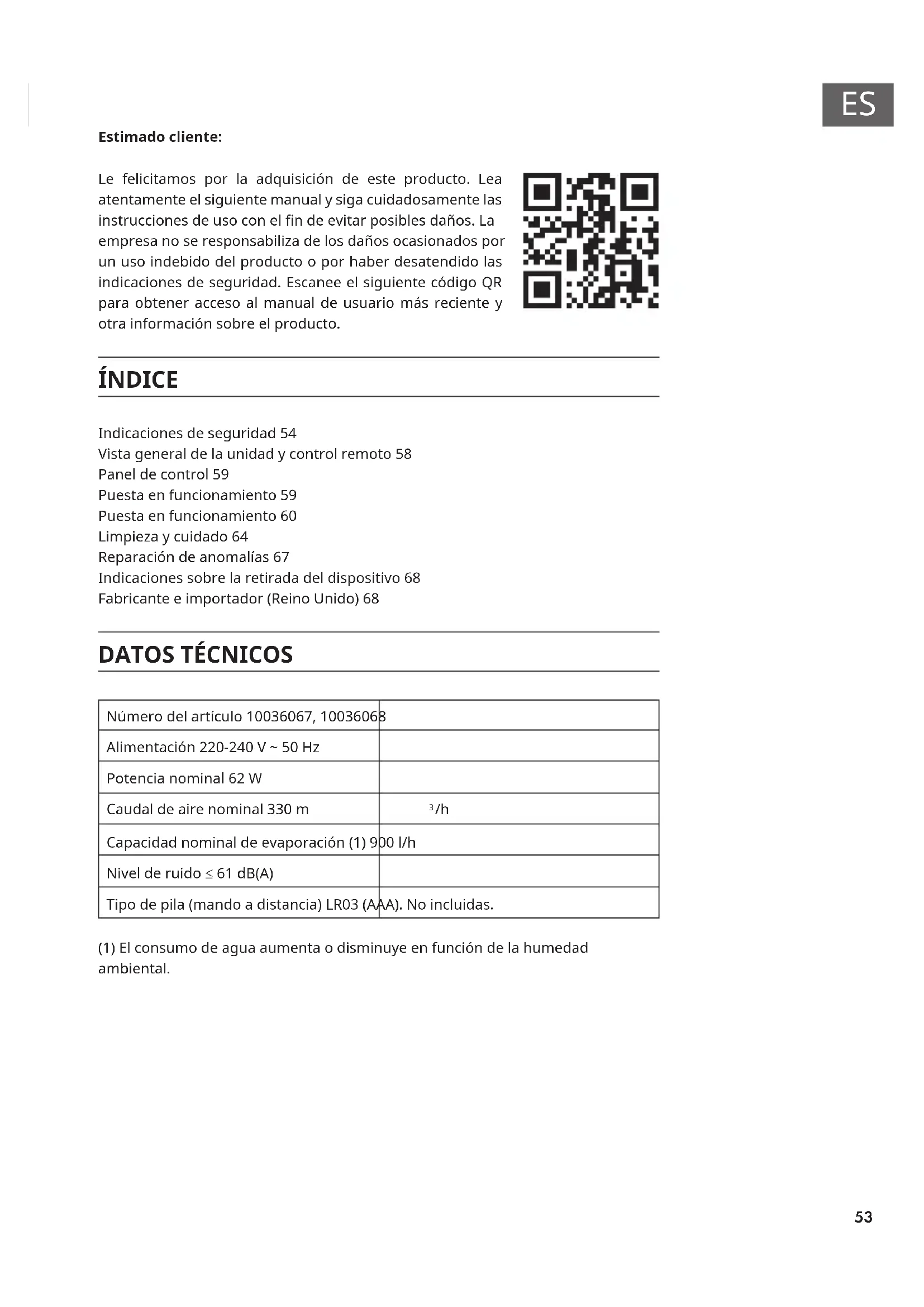 Estimado cliente: Le felicitamos por la adquisición de este producto. Lea atentamente el siguiente manual y siga cuidadosamente las instrucciones de uso con el n de evitar posibles daños. La empresa no se responsabiliza de los daños ocasionados por un uso indebido del producto o por haber desatendido las indicaciones de seguridad. Escanee el siguiente código QR para obtener acceso al manual de usuario más reciente y otra información sobre el producto. ÍNDICE Indicaciones de seguridad 54 Vista general de la unidad y control remoto 58 Panel de control 59 Puesta en funcionamiento 59 Puesta en funcionamiento 60 Limpieza y cuidado 64 Reparación de anomalías 67 Indicaciones sobre la retirada del dispositivo 68 Fabricante e importador (Reino Unido) 68