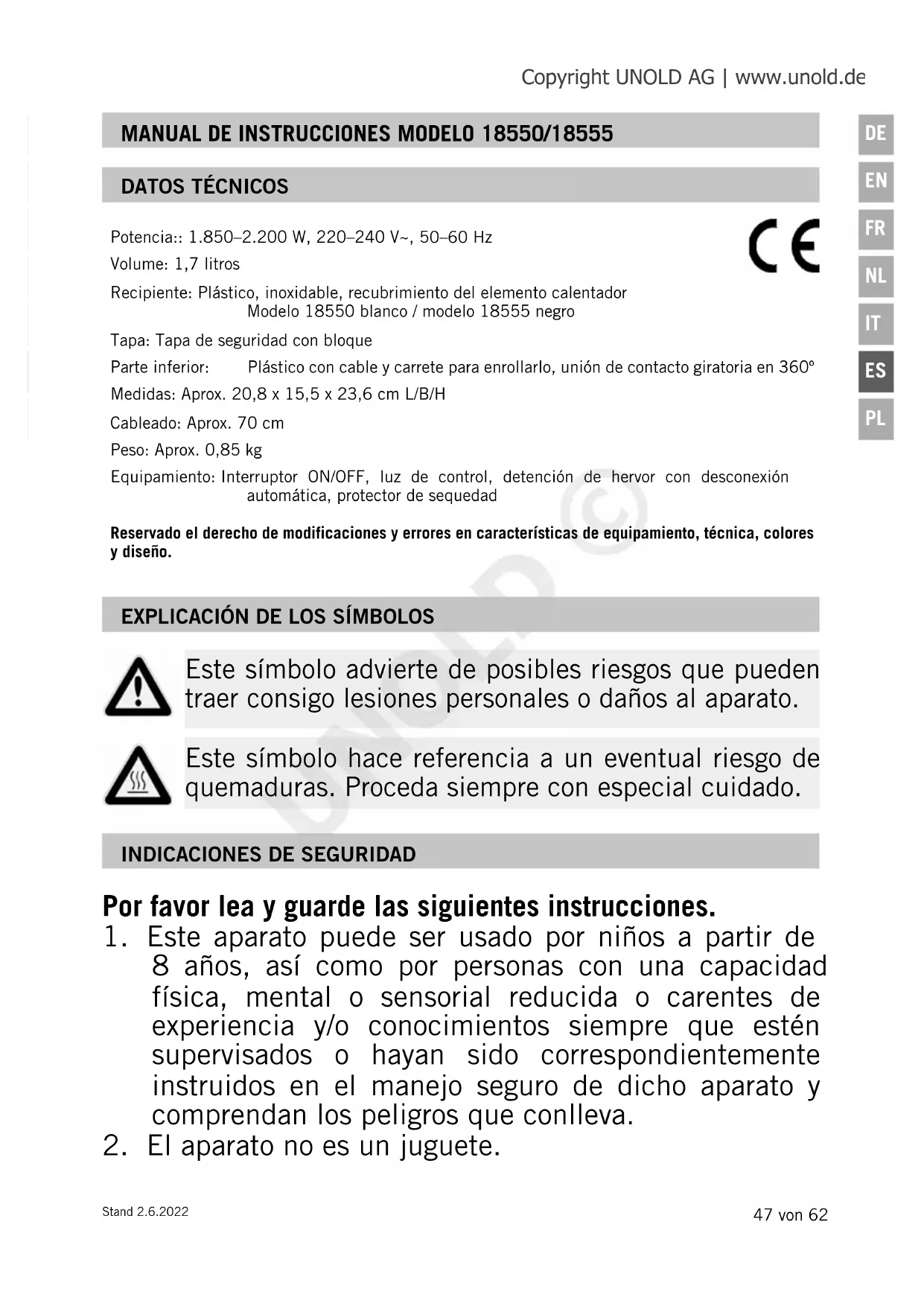 utilizar el equipo como antes de limpiarlo. Nunca deje el equipo sin control si el conector de red está conectado. Copyright UNOLD AG | www.unold.de UNOLD ©50 von 62 Stand 2.6.2022