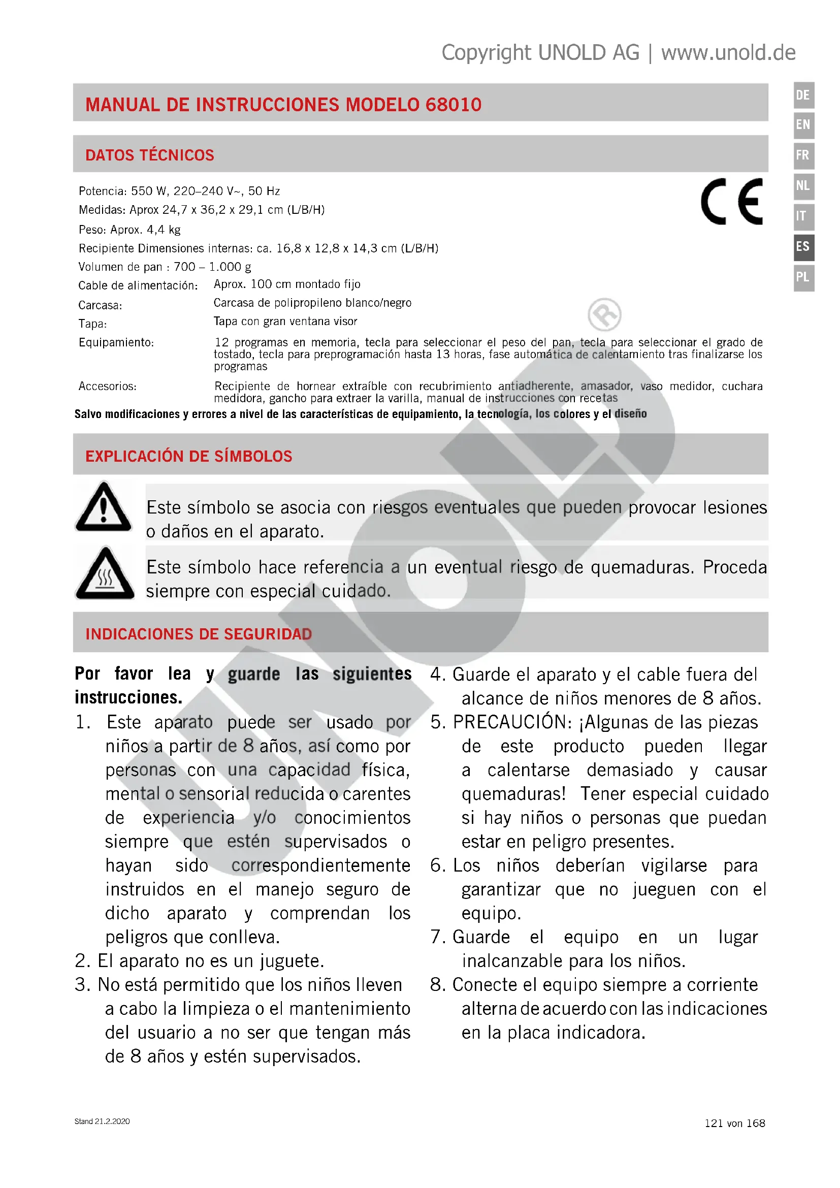 ATENCIÓN: El equipo está muy caliente durante e inmediatamente después de su uso. Copyright UNOLD AG | www.unold.deStand 21.2.2020 127 von 168
