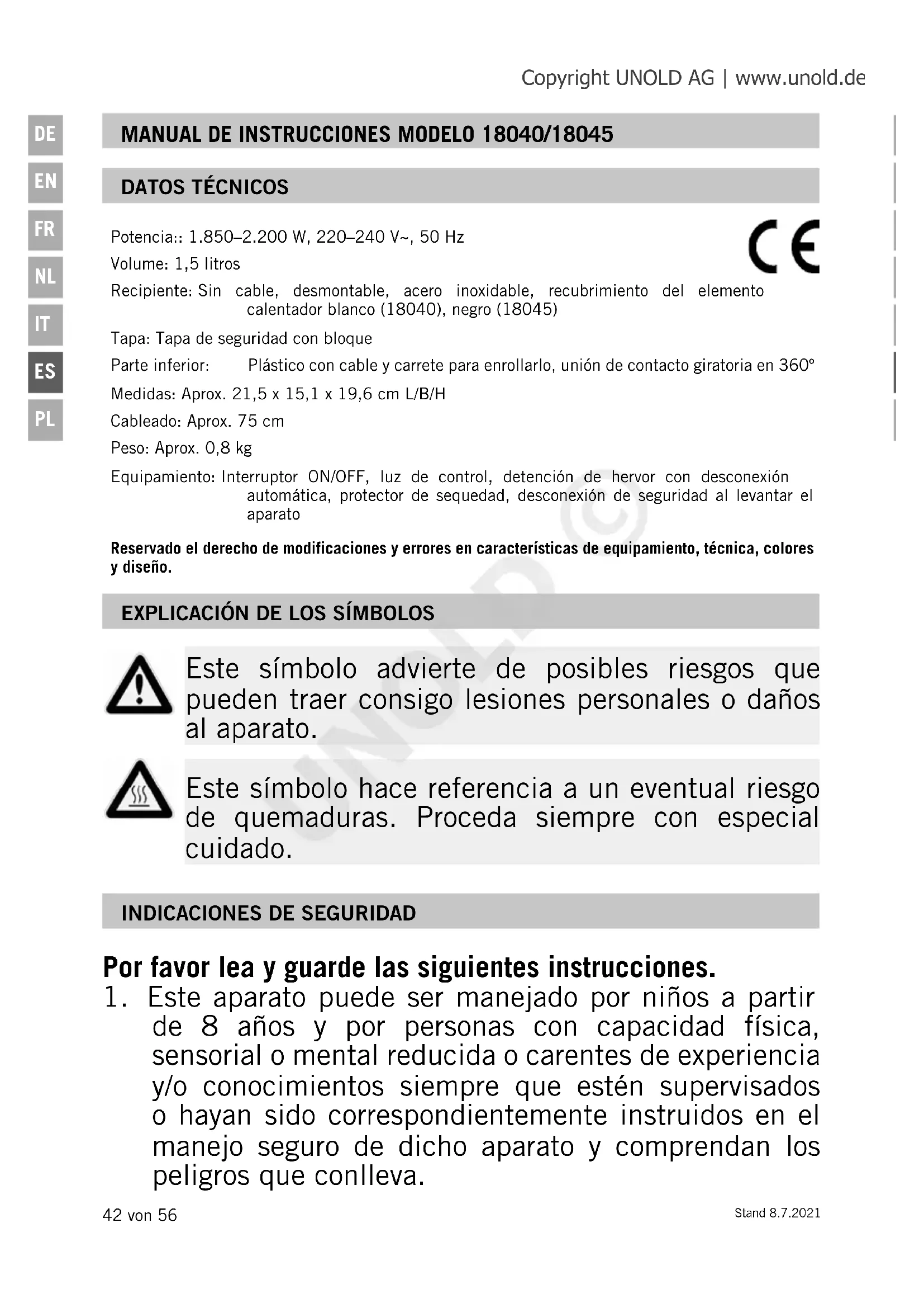 de 8 años y por personas con capacidad física, sensorial o mental reducida o carentes de experiencia y/o conocimientos siempre que estén supervisados o hayan sido correspondientemente instruidos en el manejo seguro de dicho aparato y comprendan los peligros que conlleva. Copyright UNOLD AG | www.unold.de UNOLD ©Stand 8.7.2021 43 von 56
