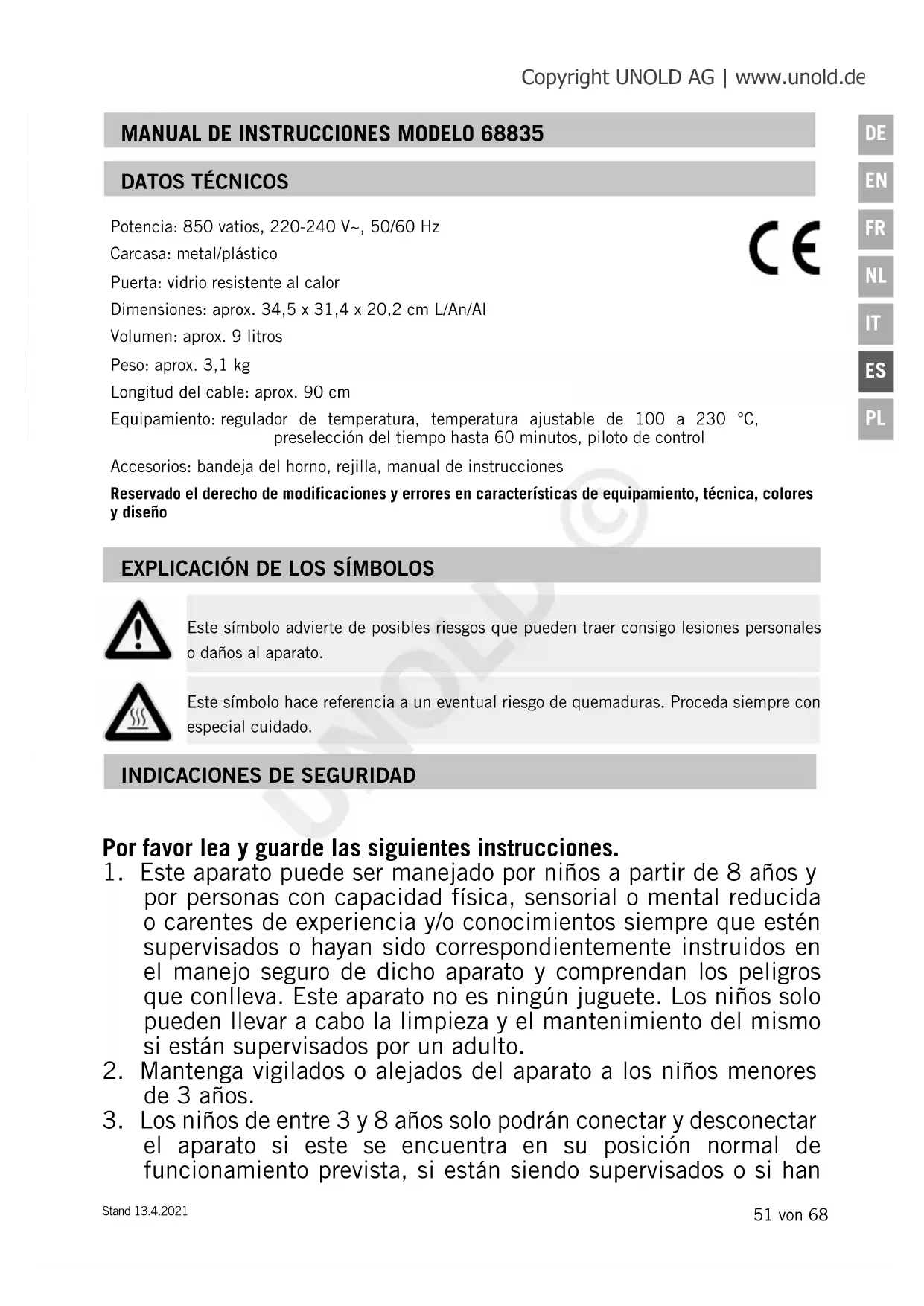 ¡ATENCIÓN! El aparato se calienta mucho durante el funcionamiento, incluso en los lados exteriores. Por ello, observe que haya ventilación suficiente y bas- tante distancia hacia todos los objetos inflamables. Utilice principalmente agarradores mientras el aparato esté funcionando y mientras esté caliente. Copyright UNOLD AG | www.unold.de UNOLD ©Stand 13.4.2021 55 von 68