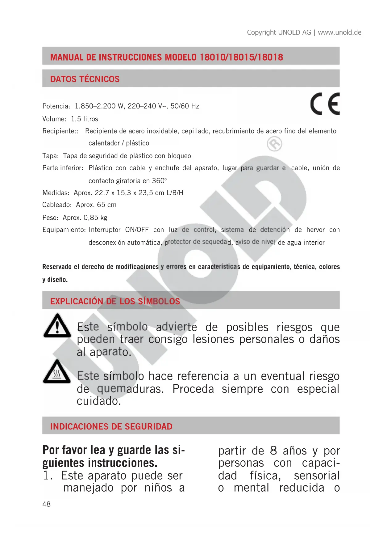 Este símbolo advierte de posibles riesgos que pueden traer consigo lesiones personales o daños al aparato. Este símbolo hace referencia a un eventual riesgo de quemaduras. Proceda siempre con especial cuidado. Potencia: 1.850–2.200 W, 220–240 V~, 50/60 Hz Volume: 1,5 litros Recipiente:: Recipiente de acero inoxidable, cepillado, recubrimiento de acero fino del elemento calentador / plástico Tapa: Tapa de seguridad de plástico con bloqueo Parte inferior: Plástico con cable y enchufe del aparato, lugar para guardar el cable, unión de contacto giratoria en 360º Medidas: Aprox. 22,7 x 15,3 x 23,5 cm L/B/H Cableado: Aprox. 65 cm Peso: Aprox. 0,85 kg Equipamiento: Interruptor ON/OFF con luz de control, sistema de detención de hervor con desconexión automática, protector de sequedad, aviso de nivel de agua interior Reservado el derecho de modificaciones y errores en características de equipamiento, técnica, colores y diseño. Copyright UNOLD AG | www.unold.de49 carentes de experien- cia y/o conocimien- tos siempre que estén supervisados o hayan sido correspondiente- mente instruidos en el manejo seguro de dicho aparato y comprendan los peligros que con- lleva. Este aparato no es ningún juguete. Los niños solo pueden lle- var a cabo la limpieza y el mantenimiento del mismo si están super- visados por un adulto.