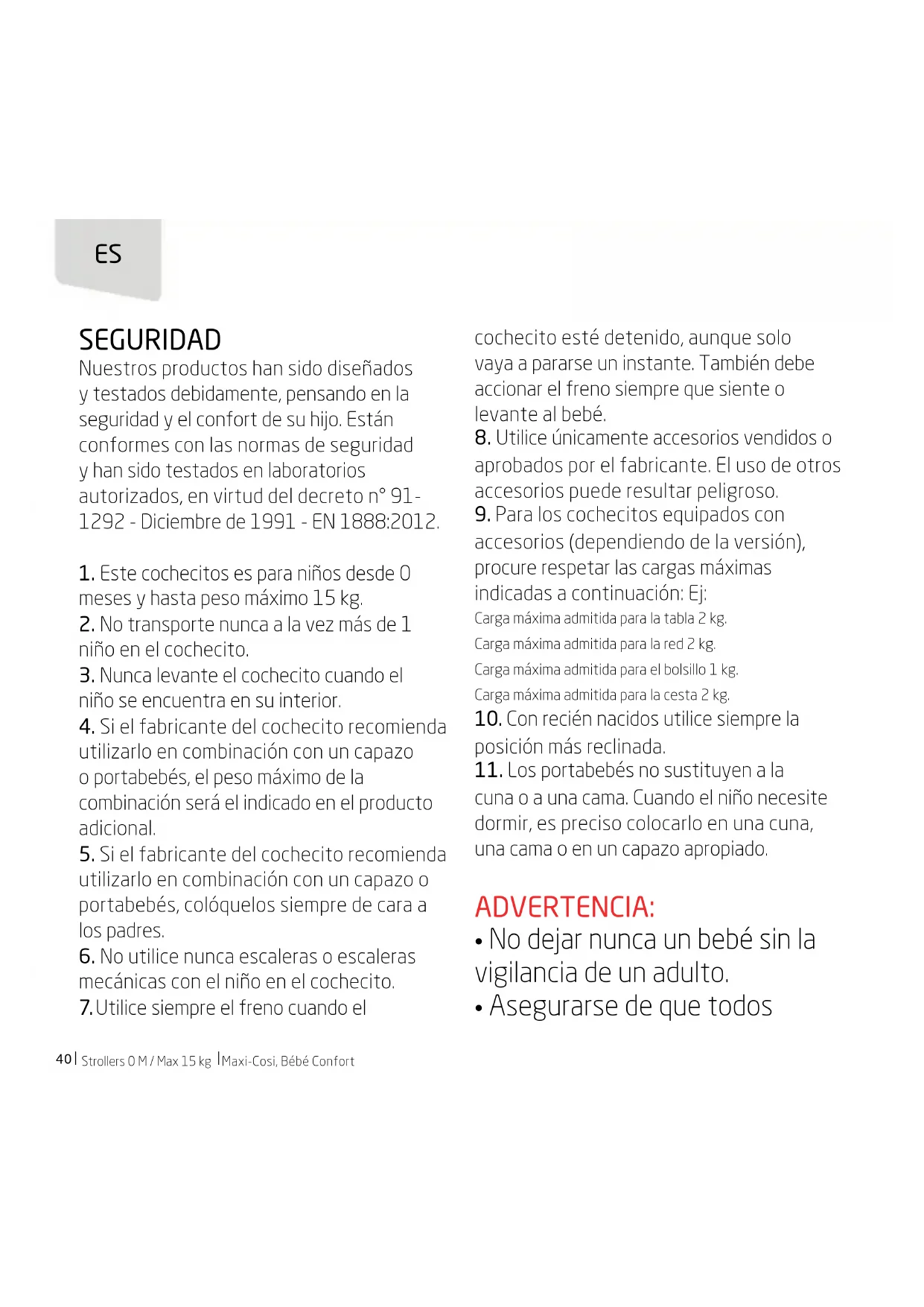 SEGURIDAD Nuestros productos han sido diseñados y testados debidamente, pensando en la seguridad y el confort de su hijo. Están conformes con las normas de seguridad y han sido testados en laboratorios autorizados, en virtud del decreto n° 91- 1292 - Diciembre de 1991 - EN 1888:2012.