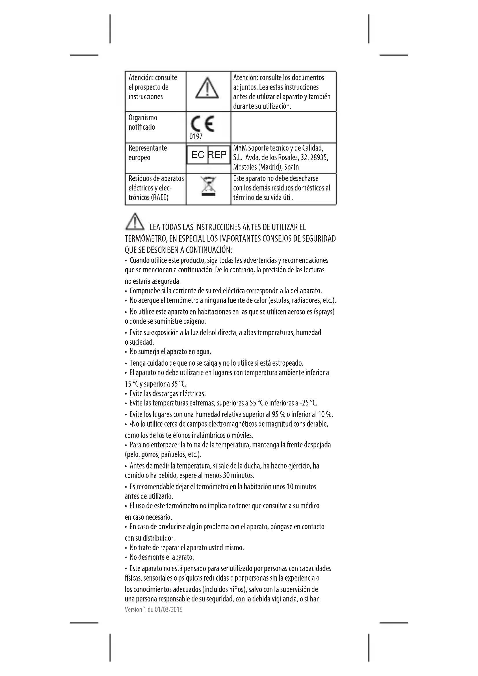 Representante europeo EC REP MYM Soporte tecnico y de Calidad, S.L. Avda. de los Rosales, 32, 28935, Mostoles (Madrid), Spain Residuos de aparatos eléctricos y elec- trónicos (RAEE) Este aparato no debe desecharse con los demás residuos domésticos al término de su vida útil. LEA TODAS LAS INSTRUCCIONES ANTES DE UTILIZAR EL TERMÓMETRO, EN ESPECIAL LOS IMPORTANTES CONSEJOS DE SEGURIDAD QUE SE DESCRIBEN A CONTINUACIÓN: