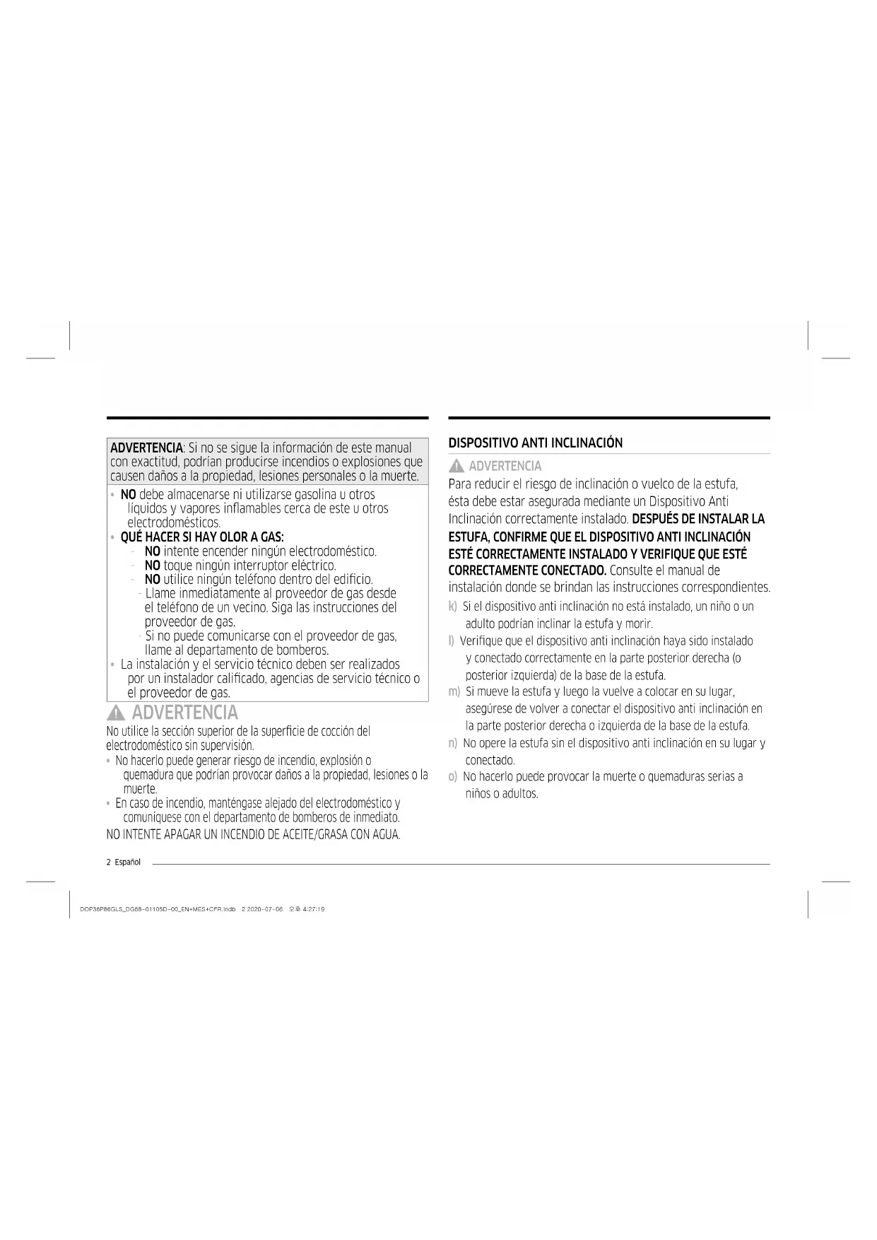 - En caso de incendio, manténgase alejado del electrodoméstico y comuníquese con el departamento de bomberos de inmediato. NO INTENTE APAGAR UN INCENDIO DE ACEITE/GRASA CON AGUA. DOP36P86GLS_DG68-01105D-00_EN+MES+CFR.indb 2 2020-07-06 오후 4:27:19Español 3 ADVERTENCIA No se pare sobre la puerta del horno de la estufa, ni se apoye o siente sobre ella. Puede causar que la estufa se incline o vuelque, produciendo quemaduras o lesiones severas. Conrme que el dispositivo anti inclinación se encuentre instalado correctamente. Luego, para vericar que dicho dispositivo esté conectado, tome el borde superior trasero de la estufa y cuidadosamente intente inclinarla hacia adelante. El dispositivo anti inclinación debería prevenir que la estufa se incline hacia adelante más de unas pocas pulgadas. Si, por cualquier razón, hala la estufa alejándola de la pared, asegúrese de que el dispositivo anti inclinación encaje correctamente cuando empuje la estufa a su lugar contra la pared. Si no se encuentra encajado, hay riesgo de que la estufa se incline o vuelque y cause lesiones si usted o un niño se parasen, sentasen o apoyasen sobre una puerta abierta. Nunca retire completamente las patas niveladoras. Si las retira, la estufa no quedará sujeta correctamente al dispositivo anti inclinación. Aviso sobre regulaciones