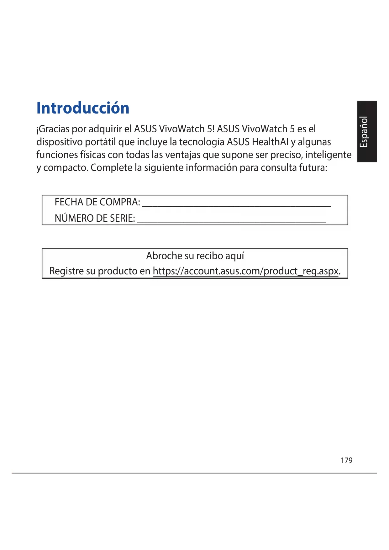 сия прошивки и нажмите Проверить обновления.179 Español Introducción ¡Gracias por adquirir el ASUS VivoWatch 5! ASUS VivoWatch 5 es el dispositivo portátil que incluye la tecnología ASUS HealthAI y algunas funciones físicas con todas las ventajas que supone ser preciso, inteligente y compacto. Complete la siguiente información para consulta futura: