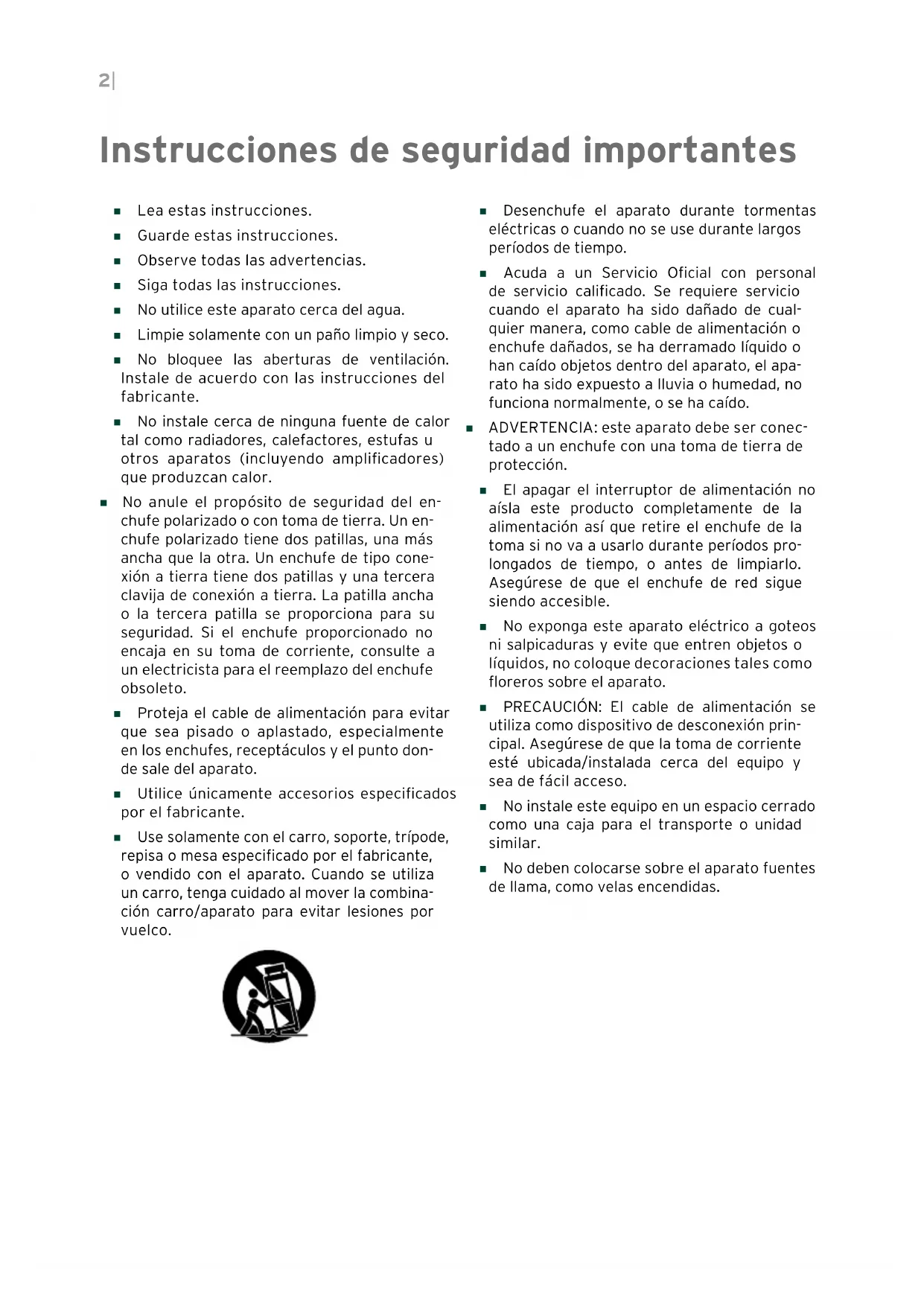 - Use solamente con el carro, soporte, trípode, repisa o mesa especificado por el fabricante, o vendido con el aparato. Cuando se utiliza un carro, tenga cuidado al mover la combina- ción carro/aparato para evitar lesiones por vuelco.