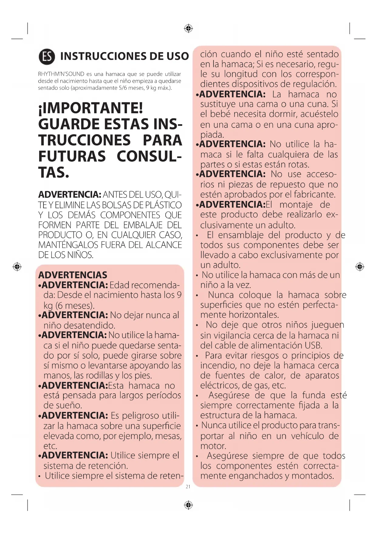 - ADVERTENCIA: No utilice la hama- ca si el niño puede quedarse senta- do por sí solo, puede girarse sobre sí mismo o levantarse apoyando las manos, las rodillas y los pies.