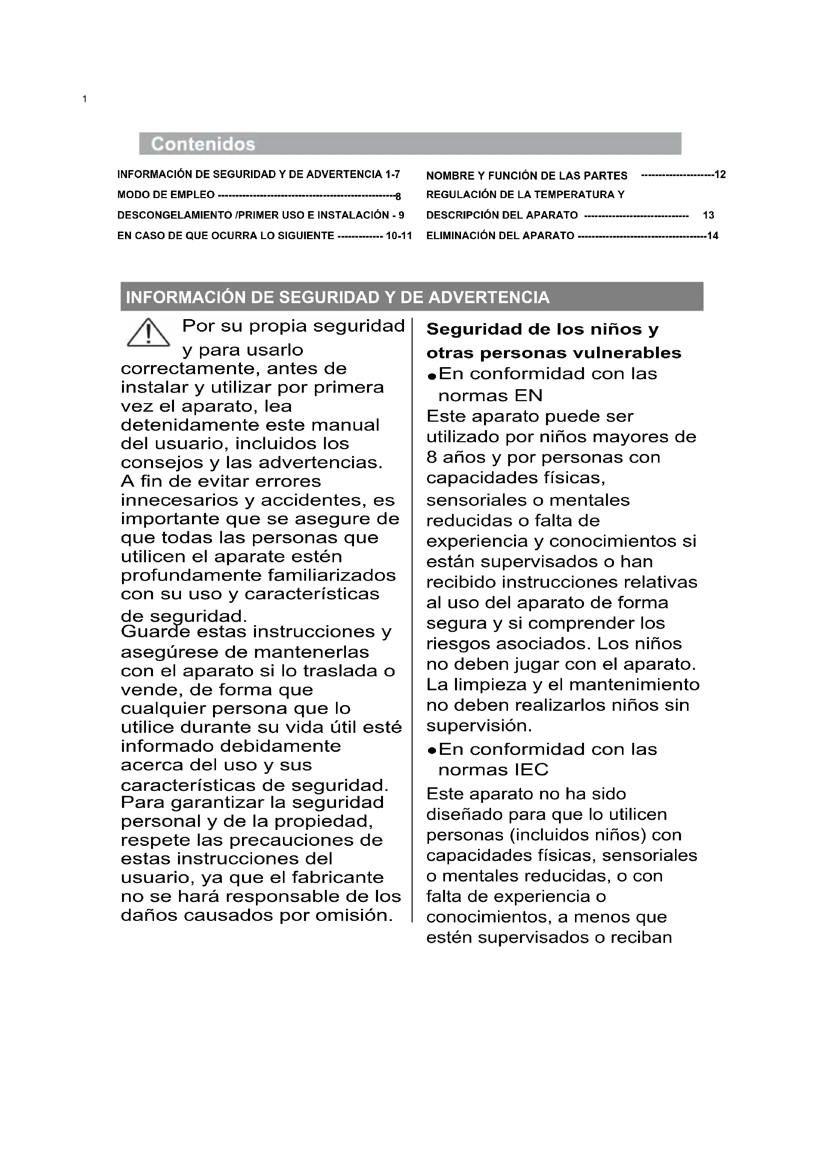 Corte el cable eléctrico y elimínelo. Eliminación correcta del producto Este símbolo en el producto o en su embalaje indica que no se debe tratar como residuos domésticos. En su lugar, debe llevarse a un punto de recogida de residuos adecuado para reciclar el equipo eléctrico y electrónico. Al asegurarse de que este producto se elimina correctamente, ayudará a prevenir las consecuencias negativas potenciales para el entorno y la salud humana, que de lo contrario podrían ser causadas por la manipulación inadecuada de los residuos de este producto. Para más información detallada acerca del reciclaje de este producto, póngase en contacto con el servicio de eliminación de residuos domésticos de su ayuntamiento o con la tienda donde compró el producto. ELIMINACIÓN DEL APARATOINFORMATIONS DE SÉCURITÉ ET AVERTISSEMENTS 1-7 UTILISATION ------------------------------------------------------------8 DÉGIVRAGE/PREMIERE MISE EN ROUTE ET INSTALLATION ---------------------------------------------------------9 SI L’UN DES CAS SUIVANTS SURVIENT ----------------- 10-11
