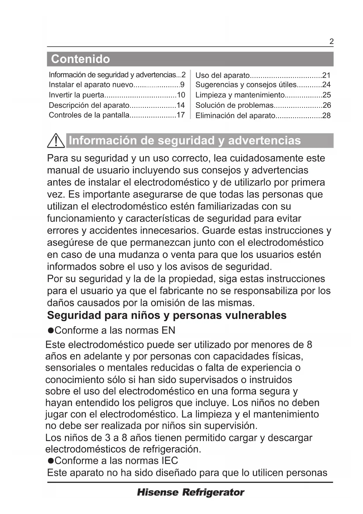 Conforme a las normas EN Este electrodoméstico puede ser utilizado por menores de 8 años en adelante y por personas con capacidades físicas, sensoriales o mentales reducidas o falta de experiencia o conocimiento sólo si han sido supervisados o instruidos sobre el uso del electrodoméstico en una forma segura y hayan entendido los peligros que incluye. Los niños no deben jugar con el electrodoméstico. La limpieza y el mantenimiento no debe ser realizada por niños sin supervisión. Los niños de 3 a 8 años tienen permitido cargar y descargar electrodomésticos de refrigeración. Conforme a las normas IEC Este aparato no ha sido diseñado para que lo utilicen personas