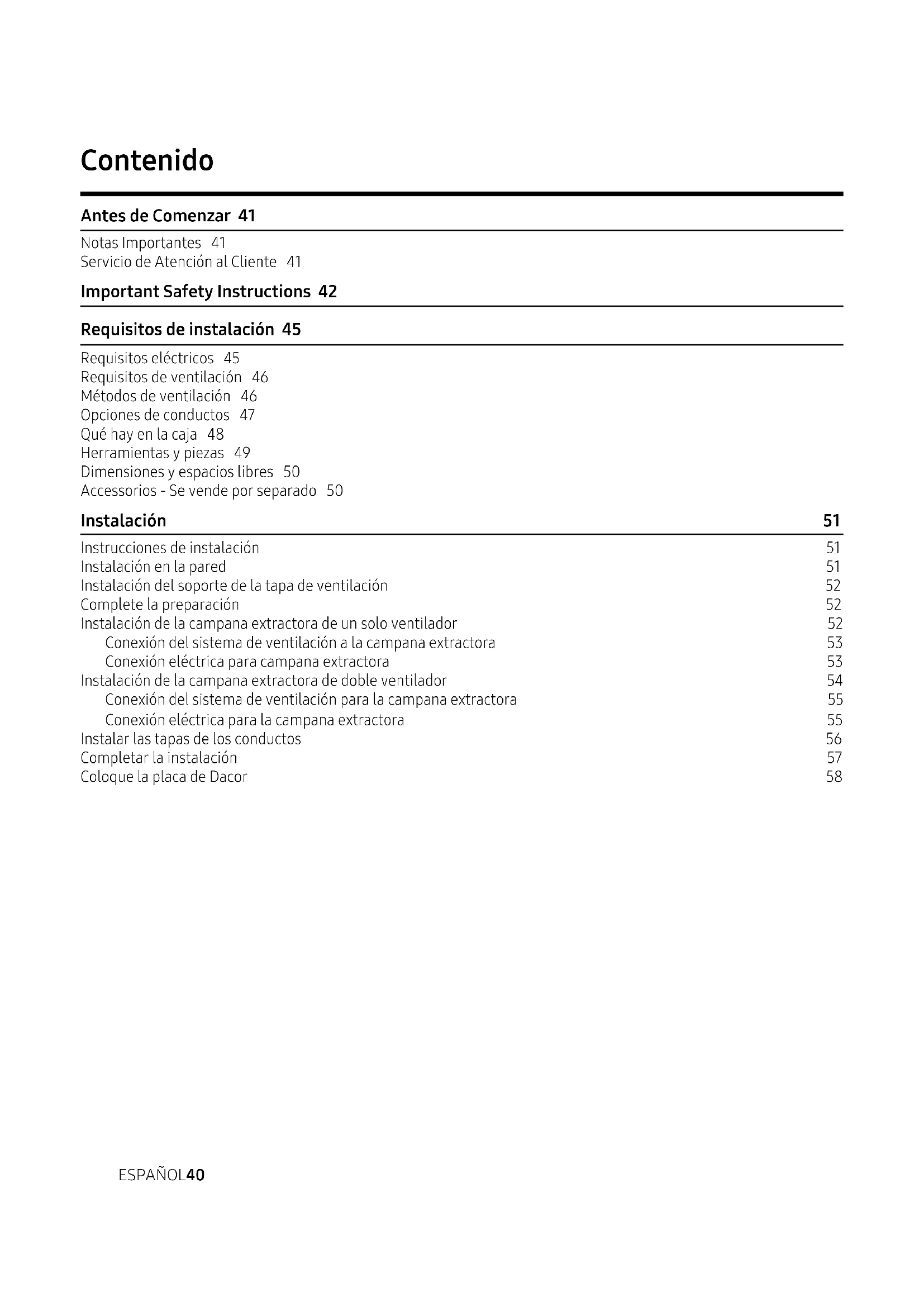 de la couvercle de gaine Couvercle de conduit NOTE: The nameplate badge has very high retention adhesive - once the nameplate badge is attached its extremely difficult to remove. Before removing the release paper from the back of the nameplate badge, practice placing the nameplate badge in the proper position on the hood without any overlap between the nameplate badge and this template. After this practice, remove the release pper from the back of the nameplate badge, and attach the nameplate badge to the hood without any overlap of the nameplate badge to this template. Remove and discard this template. Plaque Dacor InstallationESPAÑOL40 Contenido Antes de Comenzar 41 Notas Importantes 41 Servicio de Atención al Cliente 41 Important Safety Instructions 42 Requisitos de instalación 45 Requisitos eléctricos 45 Requisitos de ventilación 46 Métodos de ventilación 46 Opciones de conductos 47 Qué hay en la caja 48 Herramientas y piezas 49 Dimensiones y espacios libres 50 Accessorios - Se vende por separado 50 Instalación 51 Instrucciones de instalación 51 Instalación en la pared 51 Instalación del soporte de la tapa de ventilación 52 Complete la preparación 52 Instalación de la campana extractora de un solo ventilador 52 Conexión del sistema de ventilación a la campana extractora 53 Conexión eléctrica para campana extractora 53 Instalación de la campana extractora de doble ventilador 54 Conexión del sistema de ventilación para la campana extractora 55 Conexión eléctrica para la campana extractora 55 Instalar las tapas de los conductos 56 Completar la instalación 57 Coloque la placa de Dacor 58ESPAÑOL 41 Antes de Comenzar Notas Importantes Instalador
