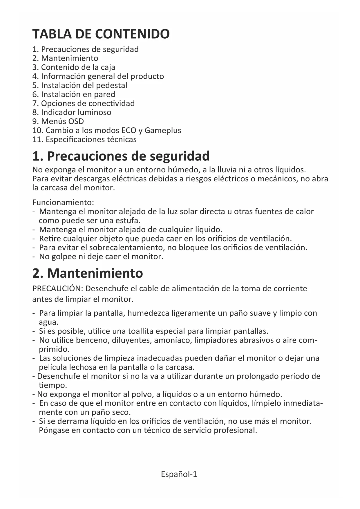 No exponga el monitor a un entorno húmedo, a la lluvia ni a otros líquidos. Para evitar descargas eléctricas debidas a riesgos eléctricos o mecánicos, no abra la carcasa del monitor. PRECAUCIÓN: Desenchufe el cable de alimentación de la toma de corriente antes de limpiar el monitor. Español-1 Funcionamiento: - Mantenga el monitor alejado de la luz solar directa u otras fuentes de calor como puede ser una estufa. - Mantenga el monitor alejado de cualquier líquido. - Rere cualquier objeto que pueda caer en los orificios de venlación. - Para evitar el sobrecalentamiento, no bloquee los orificios de venlación. - No golpee ni deje caer el monitor. - Para limpiar la pantalla, humedezca ligeramente un paño suave y limpio con agua. - Si es posible, ulice una toallita especial para limpiar pantallas. - No ulice benceno, diluyentes, amoníaco, limpiadores abrasivos o aire com- primido. - Las soluciones de limpieza inadecuadas pueden dañar el monitor o dejar una película lechosa en la pantalla o la carcasa. - Desenchufe el monitor si no la va a ulizar durante un prolongado período de empo. - No exponga el monitor al polvo, a líquidos o a un entorno húmedo. - En caso de que el monitor entre en contacto con líquidos, límpielo inmediata- mente con un paño seco. - Si se derrama líquido en los orificios de venlación, no use más el monitor. Póngase en contacto con un técnico de servicio profesional.3. Contenido de la caja