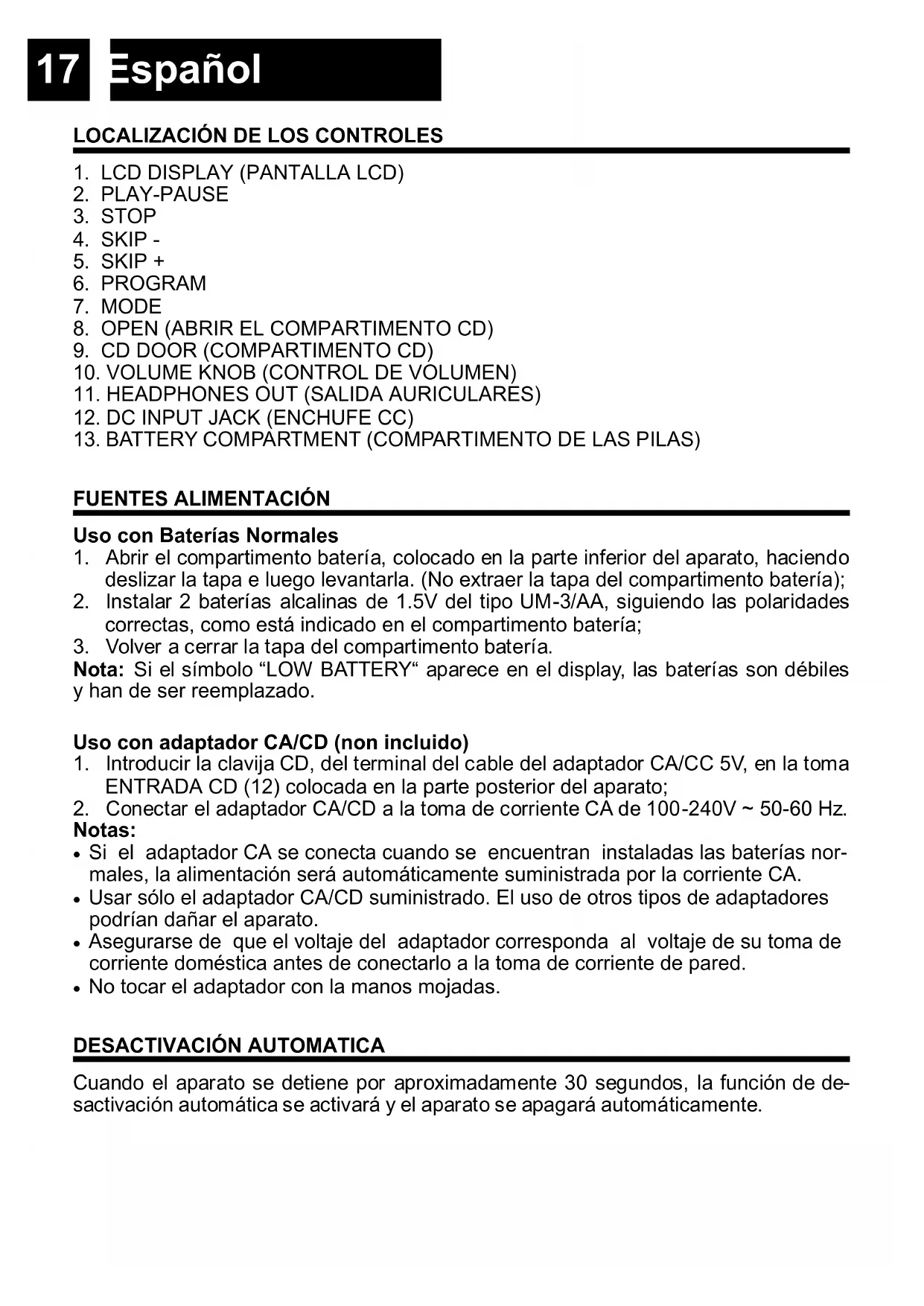 Nota: Si el símbolo “LOW BATTERY“ aparece en el display, las baterías son débiles y han de ser reemplazado. Uso con adaptador CA/CD (non incluido)