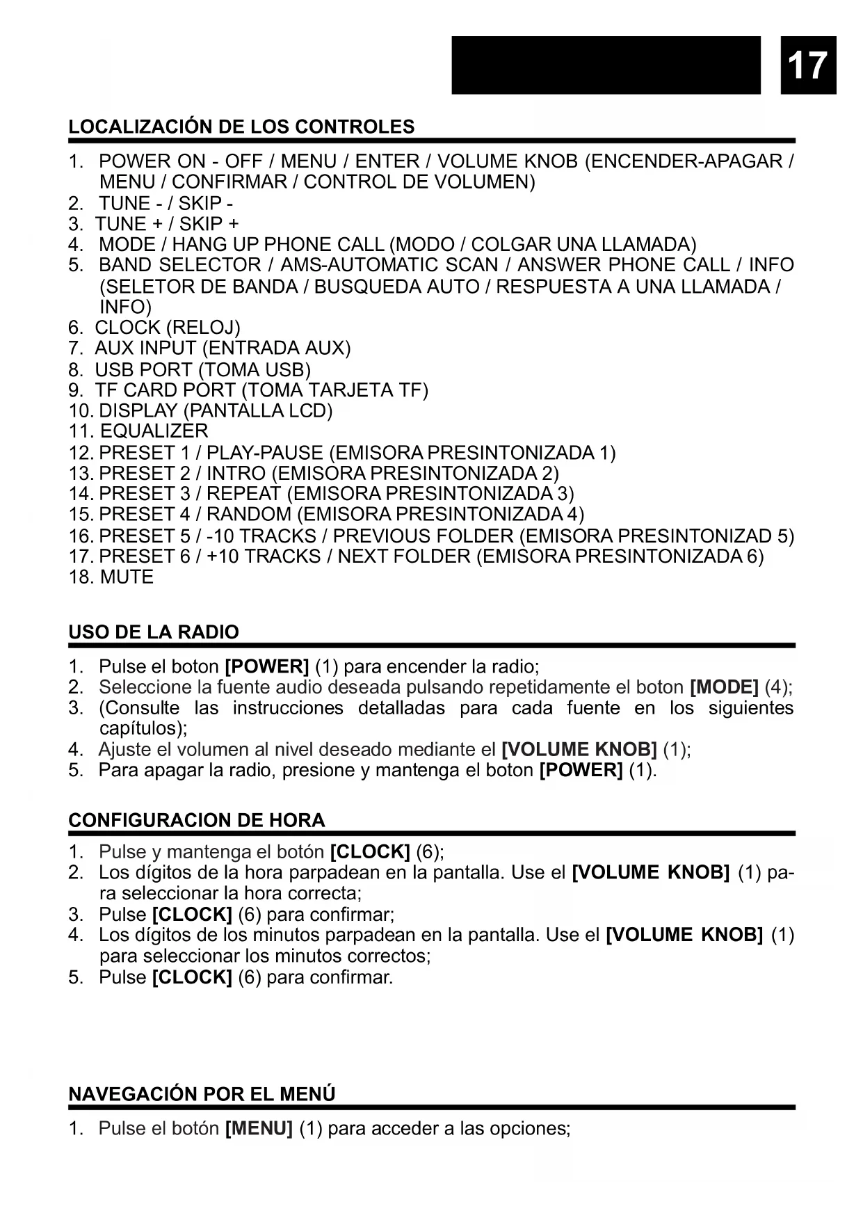 y mantenga pulsado (2 segundos) el botón y buscará la próxima emisora disponible. BUSQUEDA AUTOMÁTICA: Pulse y mantenga el botón [AMS] (5) (durante 3 segundos) para iniciar la búsqueda. Durante el proceso la radio guardará las estaciones secuencialmente en la memoria. PRESINTONIZAR EMISORAS Hay 6 x 3 (FM1, FM2, FM3) emisoras presintonizadas para radio FM y 6 x 2 (AM1, AM2) para AM.