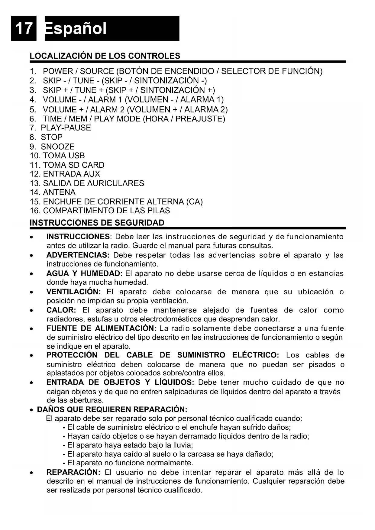 Fuente de alimentacion: CA 230V ~ 50Hz. CC 9V = (6 x “LR14” Baterias). Cobertura de radiofrecuencia FM: 87.5 - 108 MHz. Altavoz Potencia de salida: 2 x 1 Watt rms. Potencia maxima de salida: 2 x 8 Watt. General Salida Auriculares: 3.5mm jack. Entrada Aux-In: 3.5mm jack. Versión Toma USB: USB 2.0. Las características tecnicas estan sujetas a cambios sin aviso previo. La presencia de esta marca en el producto o en el materiál informativo que lo acompaña, indica que al finalizar su vida útil no deberá eliminarse junto con otros residuos domésticos. Para evitar los posi bl es daños al medi o ambi ente o a l a sal ud humane que representa la eliminación incontrolada de residuos, separe este producto de otros tipos de residuos y reciclelo correctamente para promover la reutilización sostenible de recursos materia-les. Los usuarios particulares pueden contactar con el establecimiento donde adqui ri eron el producto, o con l as autori dades l ocal es pertinentes, para informarse sobre cómo y dónde pueden lIevario para que sea sometido a un reciclaje ecológico y seguro. Los usuarios comerciales pueden contactar con su proveedor y consultar las condiciones del contrato de compra. Este produco no debe eliminarse mezclado con otros residuos comerciales.