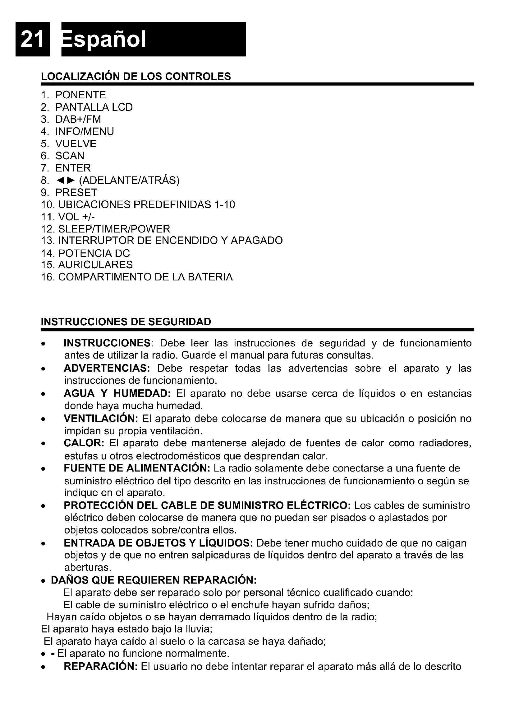 - INSTRUCCIONES: Debe leer las instrucciones de seguridad y de funcionamiento antes de utilizar la radio. Guarde el manual para futuras consultas.