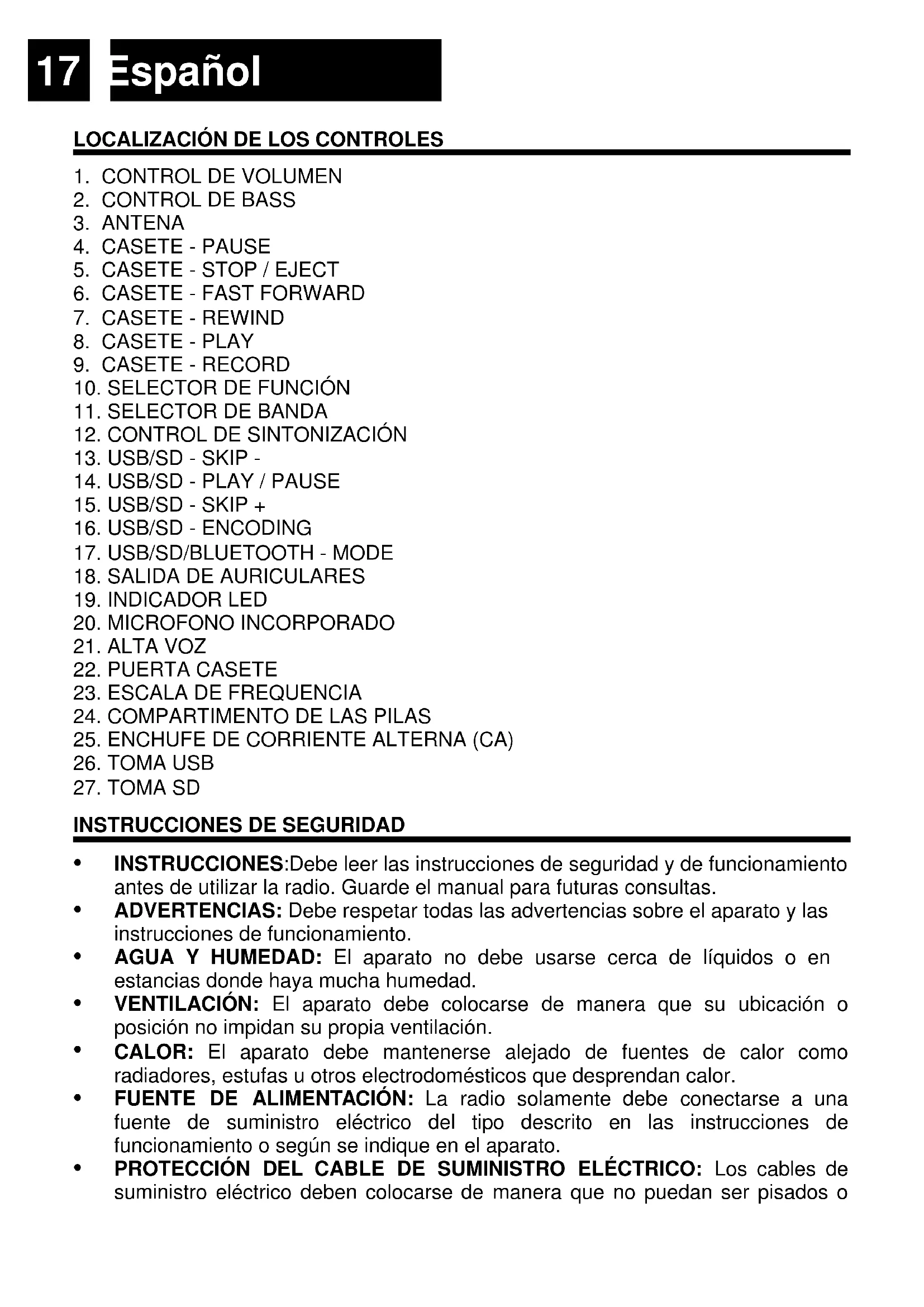 INSTRUCCIONES:Debe leer las instrucciones de seguridad y de funcionamiento antes de utilizar la radio. Guarde el manual para futuras consultas.