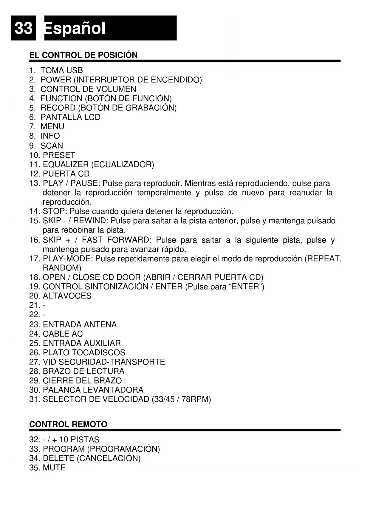 SINTONIZACIÓN] (19) o pulse y mantenga pulsado el botón [SCAN] (9) y buscará la próxima emisora disponible. PREAJUSTE Vea las instrucciones para la DAB PRESET. MENÚ FM Presione [MENU] (7) para acceder a las siguientes opciones: Scan Setting: Seleccione esta opción para elegir si desea buscar sólo las emiso-37 Español ras más potentes (estaciones fuertes) o todas las estaciones (todas las estacio- nes) Audio Setting: seleccione esta opción para elegir si desea utilizar solamente MO- NO (mono forzado) o si se debe permitir el uso de STEREO. INFO FM Pulse [INFO] (8) para ver la siguiente información: Tipo de programa / FRECUEN- CIA / AUDIO / fecha / hora. TOCADISCOS Cuando utilice la plataforma giratoria por primera vez, desatornille en sentido horario la [VID DE SEGURIDAD-TRANSPORTE] (27) apuesta sobre el extenso superior del tocadiscos.