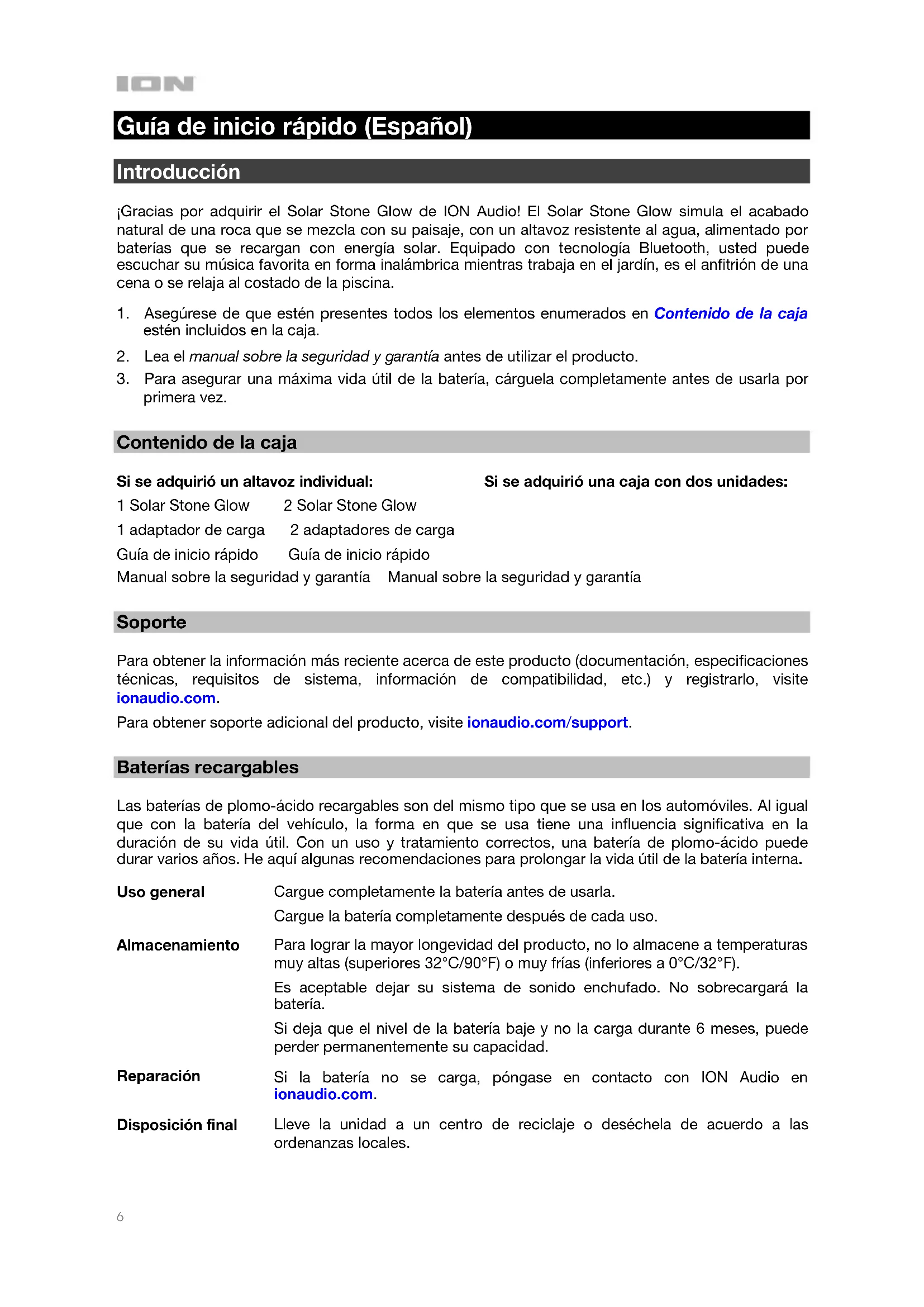 primera vez. Contenido de la caja Si se adquirió un altavoz individual: Si se adquirió una caja con dos unidades: 1 Solar Stone Glow 2 Solar Stone Glow 1 adaptador de carga 2 adaptadores de carga Guía de inicio rápido Guía de inicio rápido Manual sobre la seguridad y garantía Manual sobre la seguridad y garantía Soporte Para obtener la información más reciente acerca de este producto (documentación, especificaciones técnicas, requisitos de sistema, información de compatibilidad, etc.) y registrarlo, visite ionaudio.com. Para obtener soporte adicional del producto, visite ionaudio.com/support. Baterías recargables Las baterías de plomo-ácido recargables son del mismo tipo que se usa en los automóviles. Al igual que con la batería del vehículo, la forma en que se usa tiene una influencia significativa en la duración de su vida útil. Con un uso y tratamiento correctos, una batería de plomo-ácido puede durar varios años. He aquí algunas recomendaciones para prolongar la vida útil de la batería interna. Uso general Cargue completamente la batería antes de usarla. Cargue la batería completamente después de cada uso. Almacenamiento Para lograr la mayor longevidad del producto, no lo almacene a temperaturas muy altas (superiores 32°C/90°F) o muy frías (inferiores a 0°C/32°F). Es aceptable dejar su sistema de sonido enchufado. No sobrecargará la batería. Si deja que el nivel de la batería baje y no la carga durante 6 meses, puede perder permanentemente su capacidad. Reparación Si la batería no se carga, póngase en contacto con ION Audio en ionaudio.com. Disposición final Lleve la unidad a un centro de reciclaje o deséchela de acuerdo a las ordenanzas locales.7