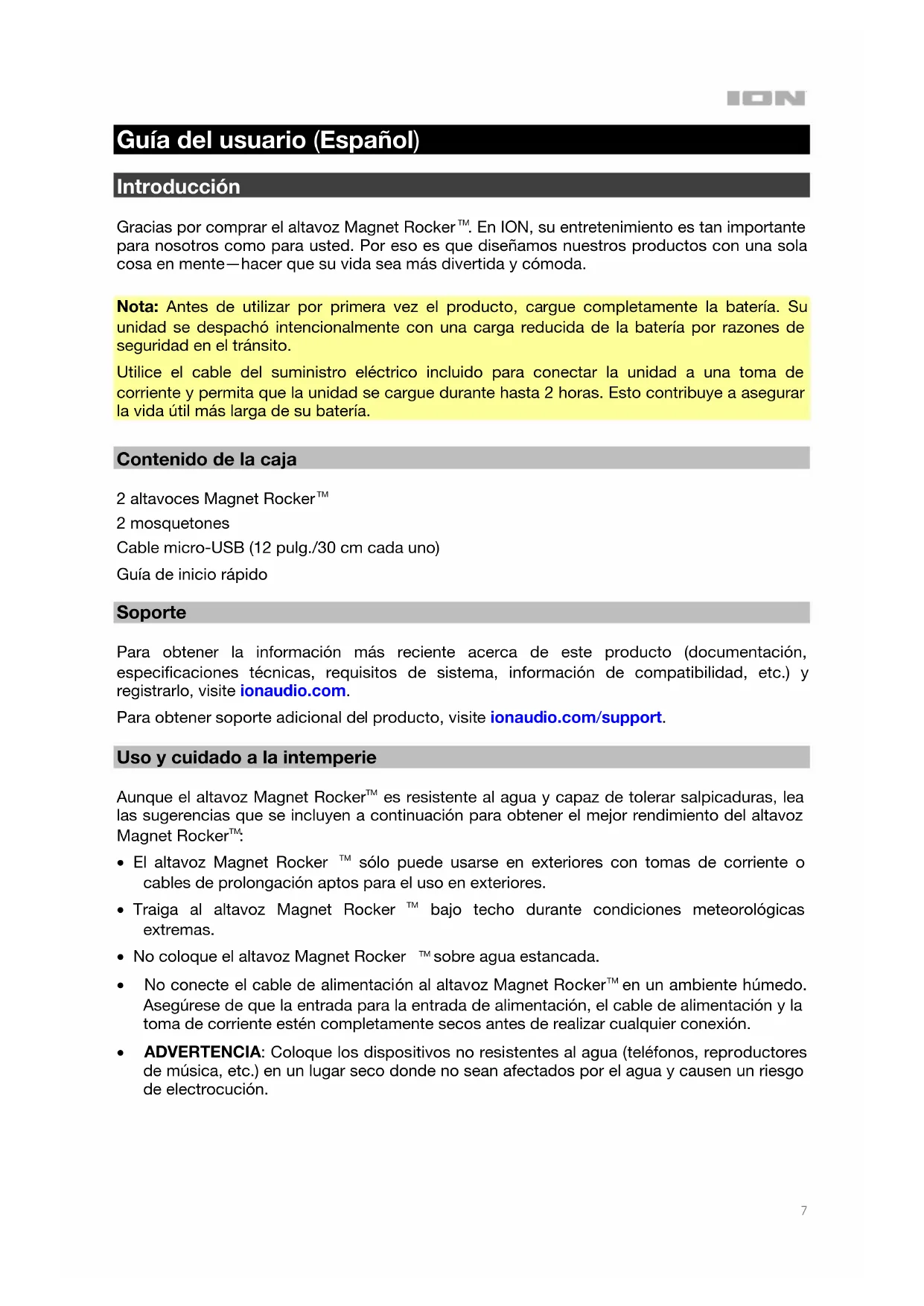 2 mosquetones Cable micro-USB (12 pulg./30 cm cada uno) Guía de inicio rápido Soporte Para obtener la información más reciente acerca de este producto (documentación, especificaciones técnicas, requisitos de sistema, información de compatibilidad, etc.) y registrarlo, visite ionaudio.com. Para obtener soporte adicional del producto, visite ionaudio.com/support. Uso y cuidado a la intemperie Aunque el altavoz Magnet Rocker