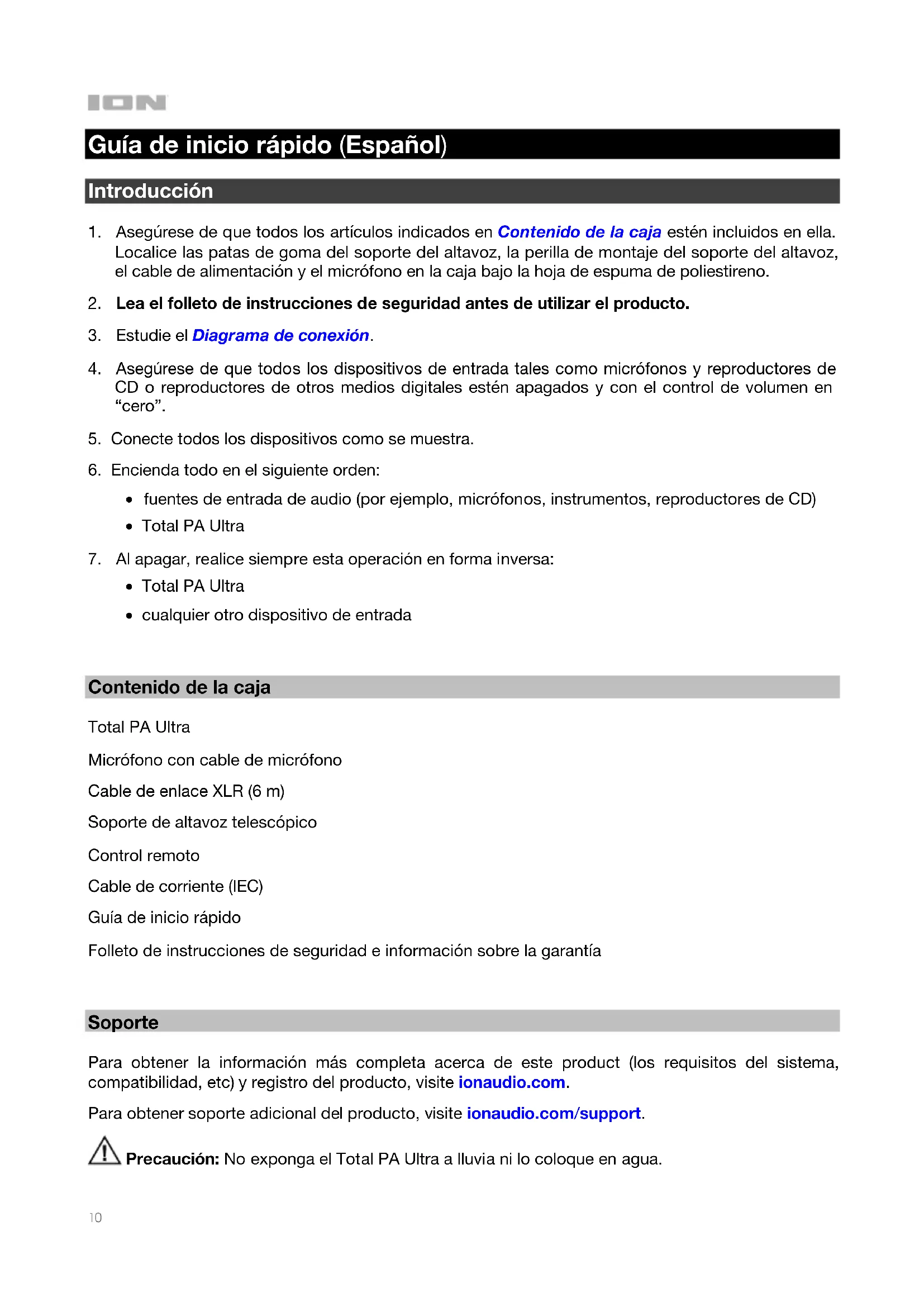 Soporte Para obtener la información más completa acerca de este product (los requisitos del sistema, compatibilidad, etc) y registro del producto, visite ionaudio.com. Para obtener soporte adicional del producto, visite ionaudio.com/support. Precaución: No exponga el Total PA Ultra a lluvia ni lo coloque en agua.11 Instalación rápida Diagrama de conexión