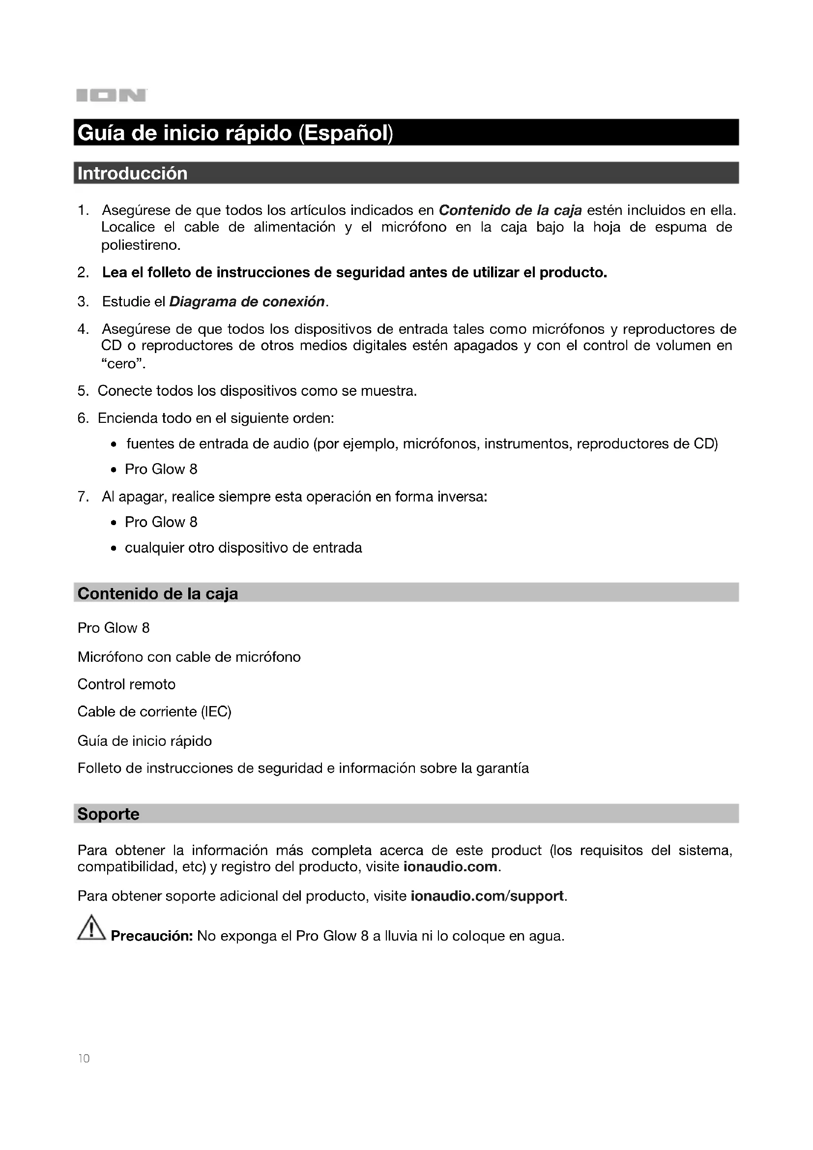 - cualquier otro dispositivo de entrada Contenido de la caja Pro Glow 8 Micrófono con cable de micrófono Control remoto Cable de corriente (IEC) Guía de inicio rápido Folleto de instrucciones de seguridad e información sobre la garantía Soporte Para obtener la información más completa acerca de este product (los requisitos del sistema, compatibilidad, etc) y registro del producto, visite ionaudio.com. Para obtener soporte adicional del producto, visite ionaudio.com/support. Precaución: No exponga el Pro Glow 8 a lluvia ni lo coloque en agua.11 Instalación rápida Diagrama de conexión