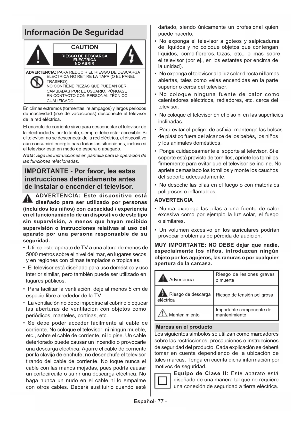 - Un volumen excesivo en los auriculares podrían provocar problemas de pérdida de audición. MUY IMPORTANTE: NO DEBE dejar que nadie, especialmente los niños, introduzcan ningún objeto por los agujeros, las ranuras o por cualquier apertura de la carcasa. Advertencia Riesgo de lesiones graves o muerte Riesgo de descarga eléctrica Riesgo de tensión peligrosa Mantenimiento Importante componente de mantenimiento Marcas en el producto Los siguientes símbolos se utilizan como marcadores sobre las restricciones, precauciones e instrucciones de seguridad del producto. Cada explicación se deberá tomar en cuenta dependiendo de la ubicación de tales marcas. Tenga en cuenta dicha información por motivos de seguridad. Equipo de Clase II: Este aparato está diseñado de una manera tal que no requiere una conexión de seguridad a tierra eléctrica.Español- 78 - Terminal Viva Peligrosa: La(s) terminal(es) marcada(s) live (viva) es/son peligrosa(s) bajo condiciones normales de operación.