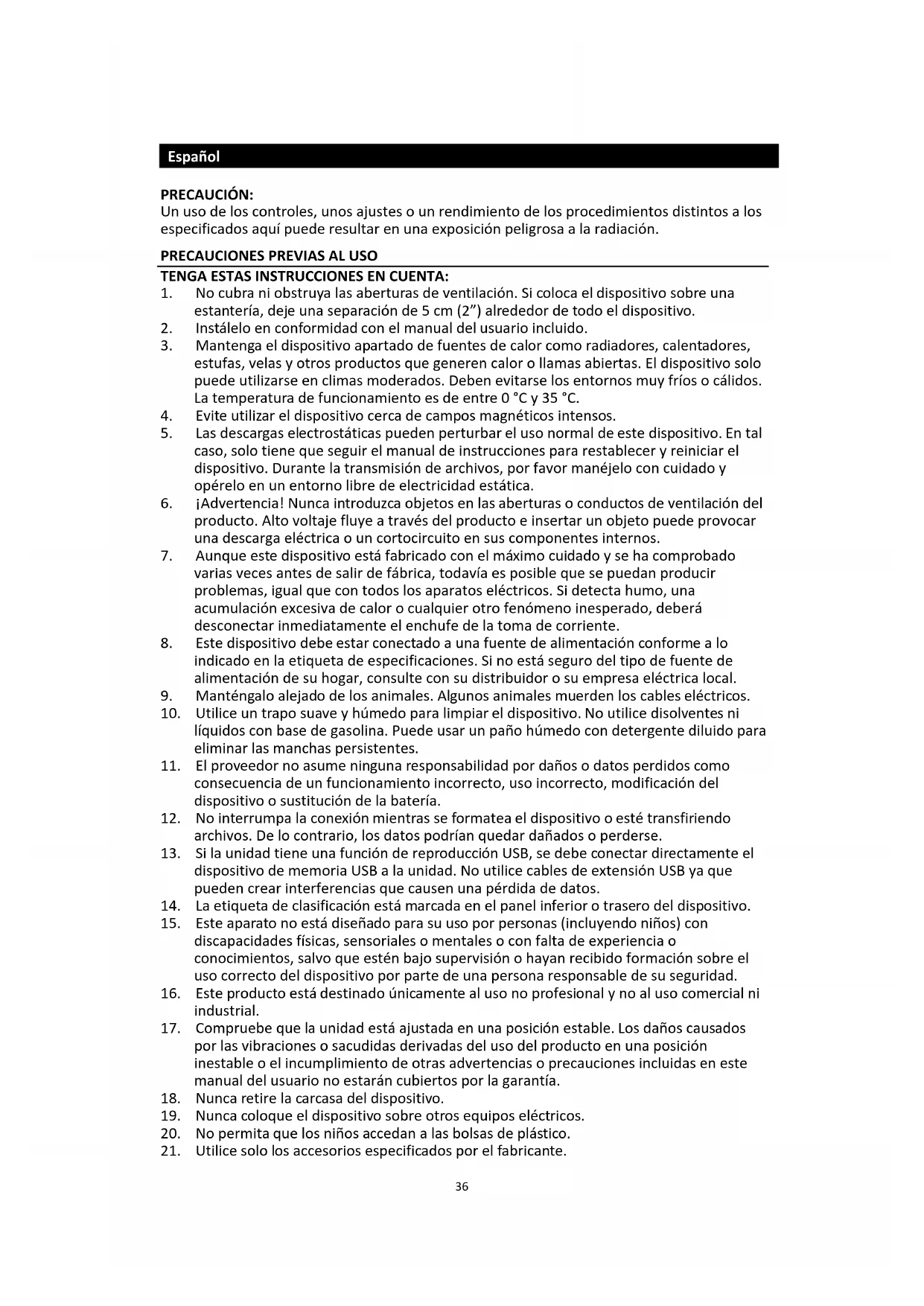 - Compruebe que la unidad está ajustada en una posicion estable. Los daños causados por las vibraciones o sacudidas derivadas del uso del producto en una posicion inestable o el incumplimiento de otheras advertencias o precauiones incluidas en este manual del usuario no estaran cubiertos por la garantia.