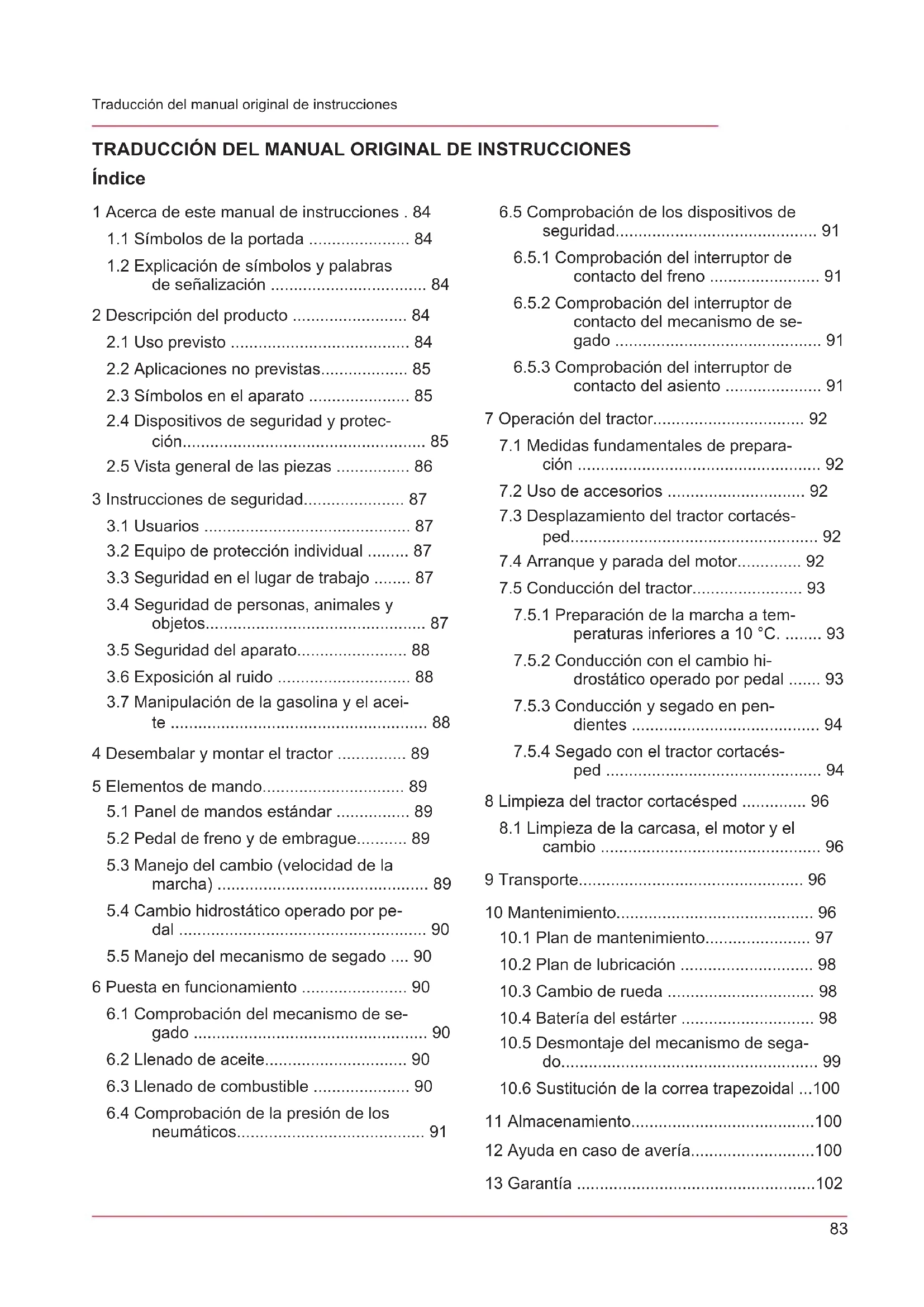 ped ............................................... 94 8 Limpieza del tractor cortacésped .............. 96