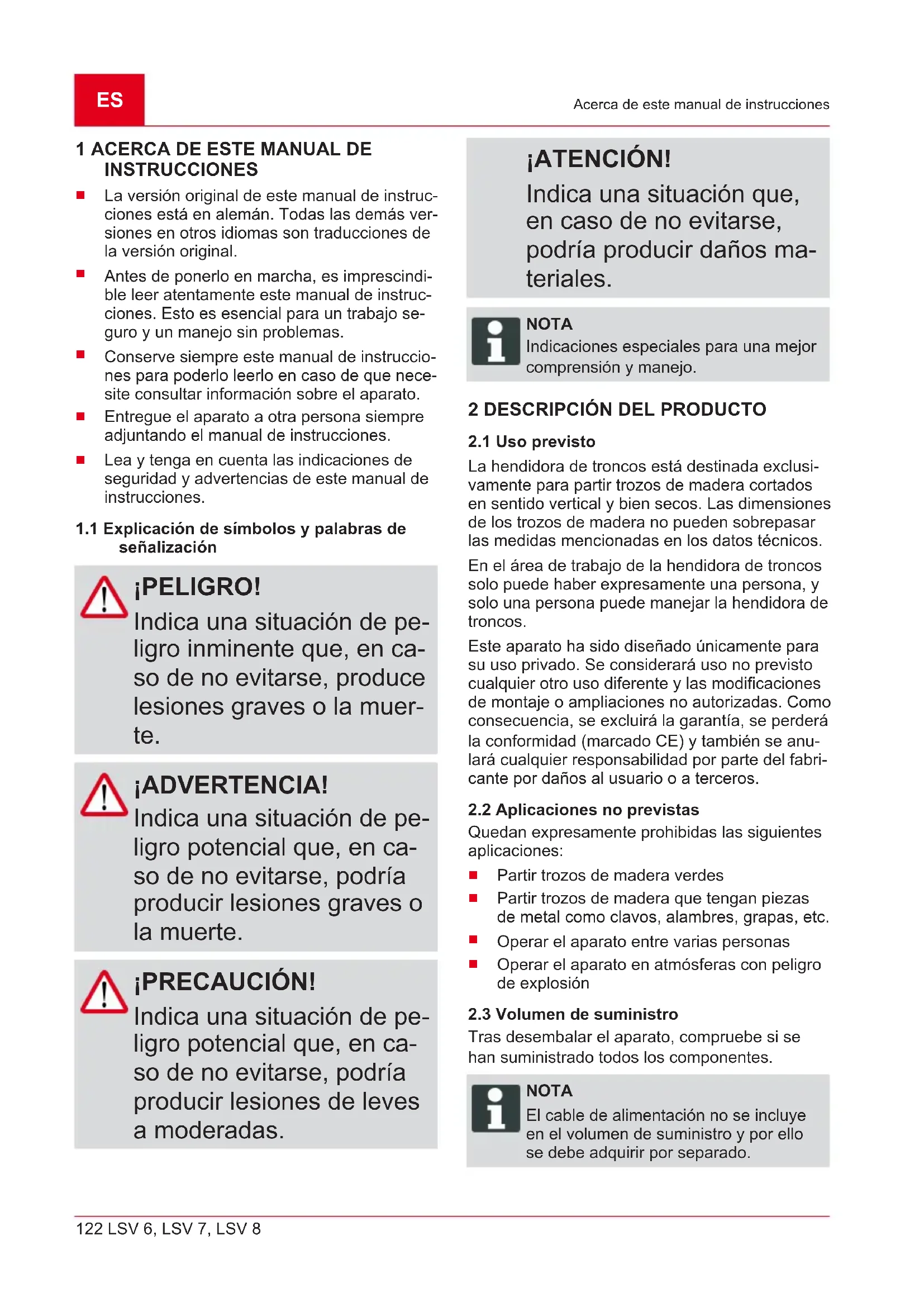 La hendidora de troncos está destinada exclusi- vamente para partir trozos de madera cortados en sentido vertical y bien secos. Las dimensiones de los trozos de madera no pueden sobrepasar las medidas mencionadas en los datos técnicos. En el área de trabajo de la hendidora de troncos solo puede haber expresamente una persona, y solo una persona puede manejar la hendidora de troncos. Este aparato ha sido diseñado únicamente para su uso privado. Se considerará uso no previsto cualquier otro uso diferente y las modificaciones de montaje o ampliaciones no autorizadas. Como consecuencia, se excluirá la garantía, se perderá la conformidad (marcado CE) y también se anu- lará cualquier responsabilidad por parte del fabri- cante por daños al usuario o a terceros.