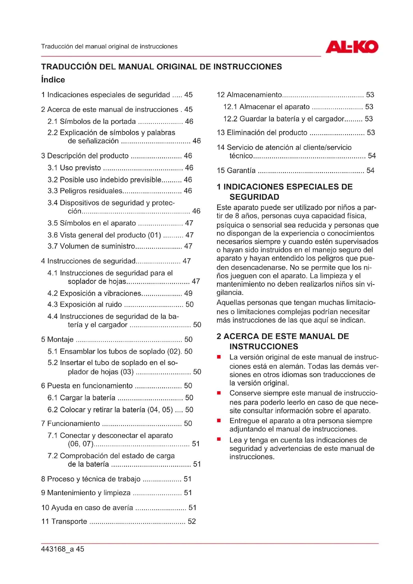 Este manual de instrucciones describe un sopla- dor de hojas de batería accionado a mano. El aparato solo puede utilizarse junto con las ba- terías de iones de litio y los cargadores que se indican en los datos técnicos. Para obtener más información sobre las baterías y los cargadores, véanse los manuales individuales: