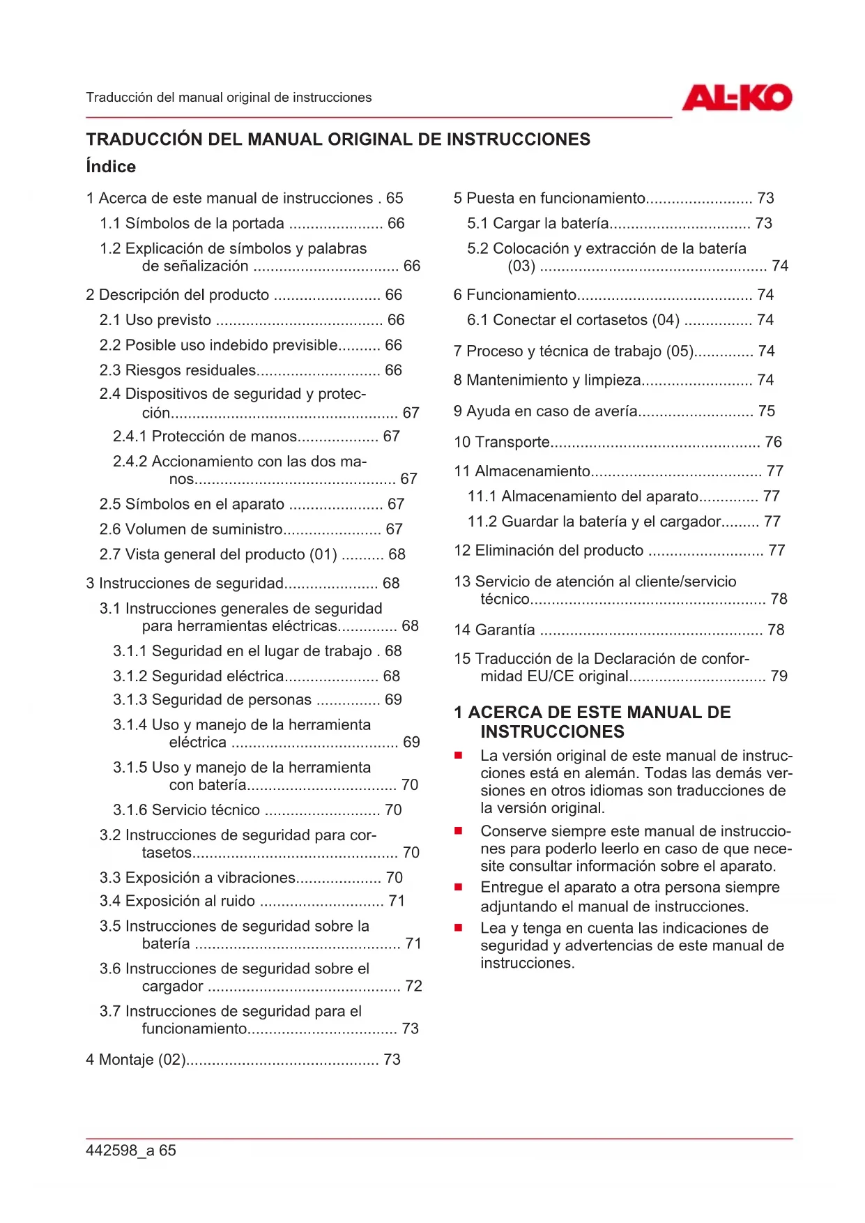 Las piezas de desgaste que están identificadas con el marco xxxxxx (x) en la ficha de piezas de repuesto442598_a 79 Traducción de la Declaración de conformidad EU/CE original El plazo de garantía comienza con la compra por parte del primer comprador final. La fecha del com- probante de compra será determinante. Diríjase al comercio donde compró el aparato o al servicio de atención al cliente autorizado más cercano con esta declaración y el comprobante de compra original. De acuerdo con esta declaración, los derechos del comprador permanecen intactos frente al vende- dor. 15 TRADUCCIÓN DE LA DECLARACIÓN DE CONFORMIDAD EU/CE ORIGINAL Por la presente, declaramos bajo nuestra única responsabilidad que este producto, en la versión que hemos comercializado, cumple los requisitos de las directivas europeas armonizadas, los estándares europeos de seguridad y los estándares específicos del producto. Producto Cortasetos con batería Número de serie G2033012 Fabricante AL-KO Geräte GmbH Ichenhauser Str. 14 89359 Kötz (Alemania) Apoderado para la recopila- ción de la documentación Andreas Hedrich Ichenhauser Str. 14 89359 Kötz (Alemania) Tipo HT 2000 Nivel de potencia acústica EN ISO 3744 medido / garantizado 80,3 dB(A) / 90 dB(A) Directivas UE 2006/42/CE 2014/30/UE 2000/14/CE 2011/65/UE Evaluación de conformidad 2000/14/CE, anexo V Normas armonizadas EN 60745-1 EN 60745-2-15 EN 55014-1 EN 55014-2 EN 62841-4-2:2015 EN 62233 Kötz, 14/08/2018 Dr. Wolfgang Hergeth Managing DirectorIT 80 HT 2000 Traduzione del manuale per l'uso originale