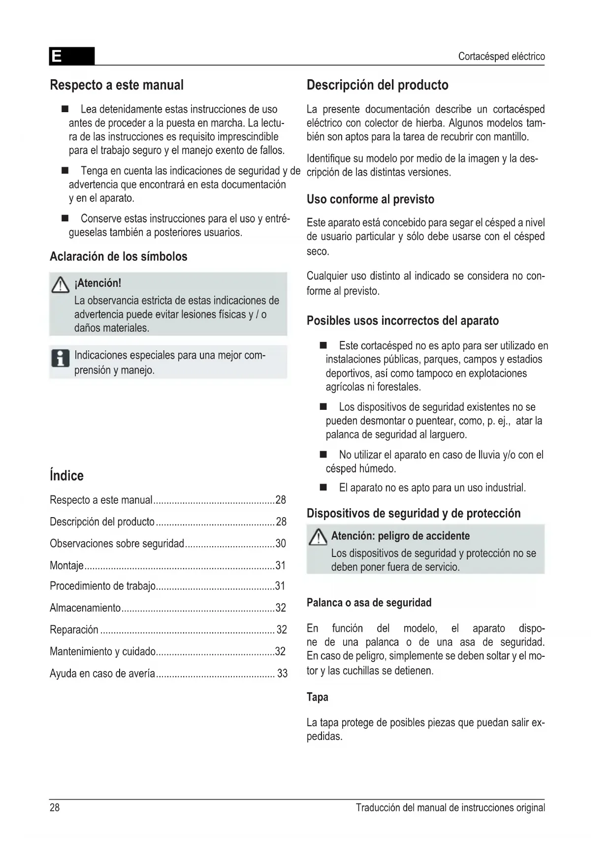 - Ayudaencasodeavería Respecto a este manual Lea detenidamente estas instrucciones de uso antes de proceder a la puesta en marcha. La lectu- ra de las instrucciones es requisito imprescindible para el trabajo seguro y el manejo exento de fallos. Tenga en cuenta las indicaciones de seguridad y de advertencia que encontrará en esta documentación y en el aparato. Conserve estas instrucciones para el uso y entré- gueselas también a posteriores usuarios. Aclaración de los símbolos ¡Atención! La observancia estricta de estas indicaciones de advertenciapuedeevitarlesionesfísicasy/o daños materiales. Indicaciones especiales para una mejor com- prensión y manejo. Descripción del producto La presente documentación describe un cortacésped eléctrico con colector de hierba. Algunos modelos tam- bién son aptos para la tarea de recubrir con mantillo. Identiquesumodelopormediodelaimagenylades- cripción de las distintas versiones. Uso conforme al previsto Este aparato está concebido para segar el césped a nivel de usuario particular y sólo debe usarse con el césped seco. Cualquier uso distinto al indicado se considera no con- forme al previsto. Posibles usos incorrectos del aparato Este cortacésped no es apto para ser utilizado en instalaciones públicas, parques, campos y estadios deportivos,asícomotampocoenexplotaciones agrícolasniforestales. Los dispositivos de seguridad existentes no se pueden desmontar o puentear, como, p. ej., atar la palanca de seguridad al larguero. No utilizar el aparato en caso de lluvia y/o con el césped húmedo. El aparato no es apto para un uso industrial. Dispositivos de seguridad y de protección Atención: peligro de accidente Los dispositivos de seguridad y protección no se deben poner fuera de servicio. Palanca o asa de seguridad En función del modelo, el aparato dispo- ne de una palanca o de una asa de seguridad. En caso de peligro, simplemente se deben soltar y el mo- tor y las cuchillas se detienen. Tapa La tapa protege de posibles piezas que puedan salir ex- pedidas.E p. 33