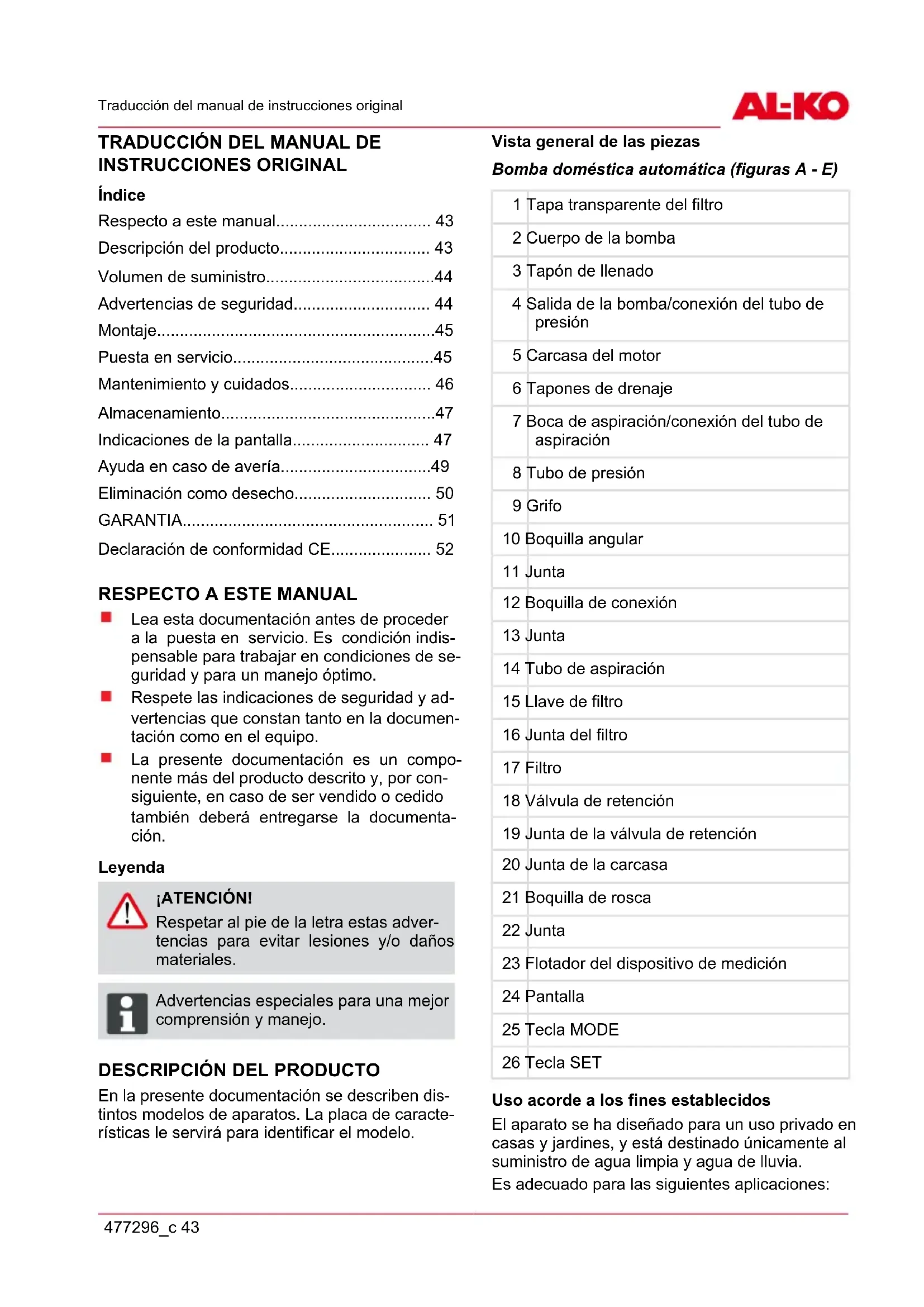 En la presente documentación se describen dis- tintos modelos de aparatos. La placa de caracte- rísticas le servirá para identificar el modelo. Vista general de las piezas Bomba doméstica automática (figuras A - E) 1 Tapa transparente del filtro 2 Cuerpo de la bomba 3 Tapón de llenado 4 Salida de la bomba/conexión del tubo de presión 5 Carcasa del motor 6 Tapones de drenaje 7 Boca de aspiración/conexión del tubo de aspiración 8 Tubo de presión 9 Grifo 10 Boquilla angular 11 Junta 12 Boquilla de conexión 13 Junta 14 Tubo de aspiración 15 Llave de filtro 16 Junta del filtro 17 Filtro 18 Válvula de retención 19 Junta de la válvula de retención 20 Junta de la carcasa 21 Boquilla de rosca 22 Junta 23 Flotador del dispositivo de medición 24 Pantalla 25 Tecla MODE 26 Tecla SET Uso acorde a los fines establecidos El aparato se ha diseñado para un uso privado en casas y jardines, y está destinado únicamente al suministro de agua limpia y agua de lluvia. Es adecuado para las siguientes aplicaciones:es Descripción del producto