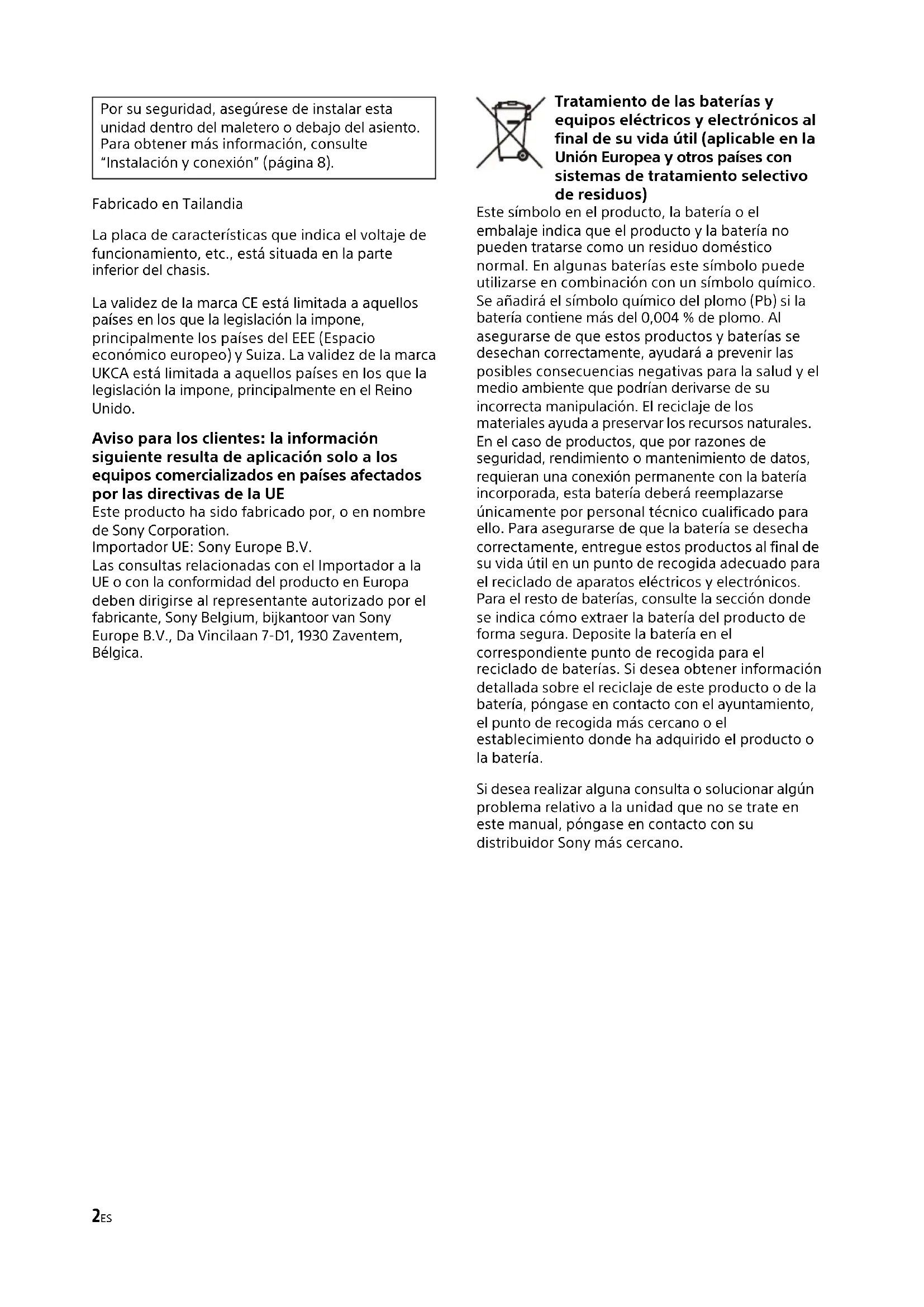 - Circuito de protección Este amplificador está provisto de un circuito de protección que actúa en los siguientes casos: – Cuando la unidad se sobrecalienta – Cuando se genera una corriente continua – Cuando se produce un cortocircuito en los terminales del altavoz La luz del indicador de estado parpadeará y la unidad se apagará. Si esto sucede, detenga la reproducción de medios, apague el equipo conectado y determine la causa del mal funcionamiento. Si esta unidad se ha sobrecalentado, espere a que se enfríe antes de utilizarla. Si desea realizar alguna consulta o solucionar algún problema relativo a la unidad que no se trate en el Manual de instrucciones, póngase en contacto con su distribuidor de Sony más cercano. Mantenimiento Cuando sustituya el fusible, asegúrese de usar uno que coincida con el valor del amperaje indicado en el fusible original. Si se funde el fusible, compruebe la conexión de la alimen tación y sustituya el fusible. Si se vuelve a fundir el fusible después de sust ituirlo, puede que haya una avería interna. Si esto ocurre, consulte al distribuidor Sony más cercano. Información adicional Sustitución de fusibles Advertencia Nunca utilice un fusible con un amperaje superior al del suministrado con el amplificador, ya que el amplificador podría sufrir daños.17ES Especificaciones Sistema de circuito: Circuito de tecnología de clase D Fuente de alimentación por impulsos Entradas: Clavijas RCA Rango de ajuste del nivel de entrada: 0,2 V - 8 V (clavijas RCA) 3 V - 16 V (entrada de alto nivel) Salidas: Terminales de altavoz Clavijas RCA Impedancia de los altavoces: 2 Ω – 8 Ω (estéreo) 4 Ω – 8 Ω (cuando se utiliza como amplificador puente) Salida máxima: 4 altavoces: 237,5 W × 4 (a 2 Ω) / Total 950 W 1 altavoz de graves/subwoofer: 950 W (a 2 Ω) Salida nominal: 2 altavoces: 330 W × 2 (a 4 Ω) 4 altavoces: 165 W × 4 (a 2 Ω), 100 W × 4 (a 4 Ω) 1 altavoz de graves/subwoofer: 450 W × 1 (a 4 Ω) 1 altavoz de graves/subwoofer: 750 W × 1 (a 2 Ω) Respuesta en frecuencia: CH 1-4: 10 Hz – 40 kHz ( dB) SUB CH: 10 Hz – 500 Hz ( dB) THD (distorsión armónica total): 0,05% o menos (a 1 kHz, 4 Ω) Filtro de paso bajo: 50 Hz - 500 Hz, 12 dB/octava 500 Hz - 5 kHz, 12 dB/octava Filtro de paso alto: 50 Hz - 500 Hz, 12 dB/octava 500 Hz - 5 kHz, 12 dB/octava Filtro subsónico: 5 Hz - 50 Hz, 24 dB/octava Requisitos de alimentación: Batería para vehículo de 12 V CC (tierra negativa) Tensión de alimentación: 10,5 V – 16 V Drenaje de corriente: A la salida nominal: 30 A (4 Ω, 100 W × 4) 80 A (2 Ω, 750 W × 1) Entrada remota: 4 mA Dimensiones: Aprox. 380 mm × 60 mm × 215 mm (an./al./pr.) 380 mm 330 mm 215 mm 196 mm 60 mm Peso: Aprox. 4,3 kg sin incluir accesorios Contenido del paquete: Unidad principal (1) Control remoto de graves (1) Componentes para la instalación y la conexión (1 juego) El diseño y las especificaciones pueden variar sin previo aviso.