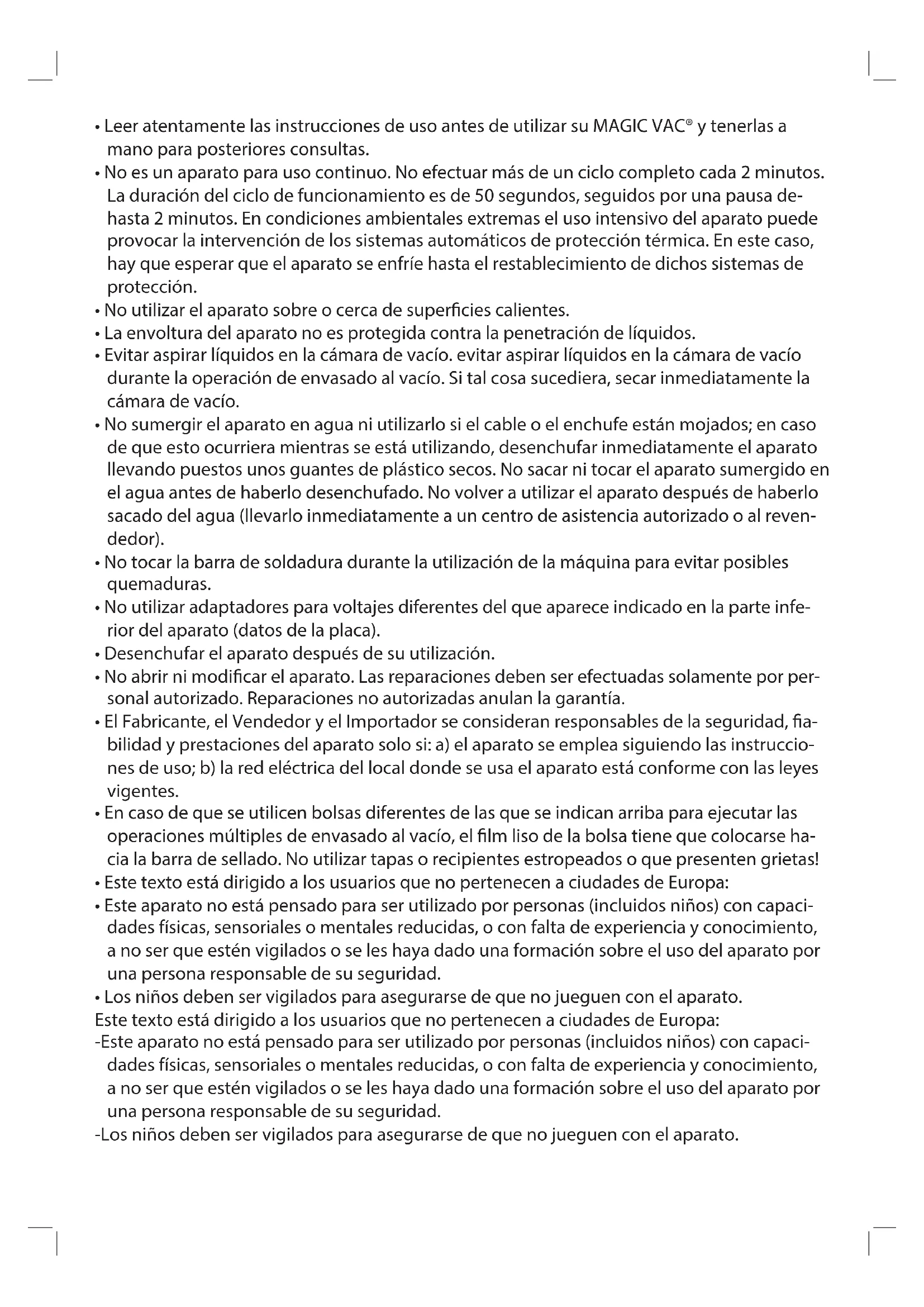 Posicione la máquina en un lugar seco sobre un plano horizontal, dejando la zona de trabajo delante de la máquina libre de obstáculos y con un espacio lo sucientemente amplio como para que se posible apoyar las bolsas con el alimento que se debe envasar. Introduzca el enchufe del cable de alimentación (1) en la toma de alimentación (2) al costado de la máquina y conéctelo después a una toma de red eléctrica que corresponda a la tensión de esta (consulte los datos en la placa). Después, presione el interruptor general (3), situado al costado de la máquina; en el display de esta se encenderán el LED verde ON (3a) y el LED rojo (7b) del tiempo (MED) de soldadura, que podrá variar entre MIN, si lo que debe envasar es seco, y MAX si es muy húmedo. Con el pulsador “STOP/CANCEL” (9) puede interrumpir en cualquier momento cualquier ciclo iniciado. Envasado en las bolsas Use únicamente bolsas y rollos originales MAGIC VAC®. Ciclo automático a) Introduzca el alimento en la bolsa sin crear arrugas o tensiones en las supercies. Elimine los líquidos o los residuos de alimento de la zona interna de la boca de la bolsa que debe ser soldada. b) Levante la tapa (13) y coloque delante de la máquina la bolsa con su contenido, posicionando el extremo abierto dentro de la cuba de líqui- dos extraíble (15) (véase la Fig. E) con la parte lisa hacia arriba. c) Baje la tapa (13) presionando los dos extremos P hasta bloquear las palancas de enganche laterales (12) (g. B). Puede vericar la correcta posición de la bolsa en la cámara de vacío a través del visor (13.a) d) Presione el pulsador “A” (4) del ciclo automático. La máquina efectuará el ciclo de envasado completo. e) Espere hasta que deje de parpadear el LED rojo del pulsador “T “ (7) (g. A); después, desbloquee la tapa (13) tomando ambas palancas de enganche laterales (12) y nalmente extraiga la bolsa. f) Controle la validez de la soldadura obtenida, que deberá presentarse como una línea regular transversal, libre de arrugas y de líneas dentro de la bolsa. Función Pulse (Para limitar la extracción del aire y no aplastar la comida delicada y frágil) a) Repita las operaciones de a) a c) del Ciclo Automático b) Pulse y mantenga pulsado el botón “P” (5) (g. A) para arrancar el ciclo manual de vacío, suelte el botón para interrumpirlo. Repita esta opera- ción hasta conseguir el vacío deseado, después active la soldadura pulsando el botón “S” (6) (g. A). para sellar la bolsa. c) Después repita las operaciones de e) a f) del Ciclo Automático Cómo retirar la bolsa del rollo Antes de repetir las operaciones de a) a f) del ciclo automático o de a) a c) de la función Pulse realice lo siguiente: a) Desenrolle la longitud adecuada del rollo, dejando al menos 8 cm extra respecto del espacio ocupado que debe envasarse y otros 2 cm para cada reutilización sucesiva de la bolsa. Corte el trozo usando el cortador de bolsas MAGIC Cutter (20) (véase la Fig. D) b) Ahora puede sellar un lado abierto del trozo levantando la tapa (13), posicione el extremo abierto en el EXTERIOR de la cuba de líquidos extraíble (15) con la parte lisa hacia arriba (g. F) y por último presione el pulsador “S” (6) (g. A). Atención: no deje que sobresalga la bolsa en la cuba de líquidos extraíble (15) o en la junta de estanqueidad (14); debe apoyar el extremo a tope sobre la parte exterior de la junta de estanqueidad (14) (véase la Fig. F). SOLDADURA INTELIGENTE MAGIC VAC® está dotada de la función de soldadura inteligente que autoregula la soldadura en función de la temperatura de la Barra soldadora que se va incrementando a medida que se suceden los ciclos de envasado consecutivos. El resultado nal de la soldadura de las bolsas depende del tipo de alimento a envasar, al igual que de la temperatura ambiente en la que Se trabaja. Envasado en recipientes ¡ATENCIÓN!: Use única y exclusivamente los recipientes MAGIC VAC® porque son resistentes al valor de vacío creado por Jumbo 30, mientras que los recipientes de otros fabricantes podrían implosionar y ocasionar heridas. a) Conecte el recipiente a la máquina introduciendo los extremos del Tubo (21) en la conexión para vacío (11) (g. A) y sobre la tapa del reci- piente posicionando el pomo según las instrucciones suministradas con el recipiente. b) Presione el pulsador “C” (8) (g. A); la máquina efectuará el ciclo de vacío automáticamente y se apagara al nalizar la operación. De todos modos, la bomba se apaga automáticamente después de 5 minutos. Al nal el ciclo, extraiga el tubo (21) del recipiente y después extráigalo de la conexión para vacío (11) de la máquina. Marinado rápido Mediante la función exclusiva “marinado rápido”, la máquina conserva el vacío en el recipiente durante varios minutos y después lo libera automáticamente, permitiendo que el alimento “repose” durante 30 segundos. Repitiendo la acción del pulsador de vacío y el reposo varias veces, se obtiene un marinado muy rápido. Use únicamente el recipiente original cuadrado especíco MAGIC VAC® Executive de 2,5 litros (cód. ACO1073) a. Botones + y – Preset Vacuum Sirven , respectivamente, para aumentar y/o disminuir el valor de vacío precongurado (véase el punto b). b. LED amarillos Vacuum Control Indican los ocho niveles de vacío que pueden seleccionarse con las teclas + y – NOTA: Durante el primer encendido, los LED estarán siempre encendidos (valor máximo de vacío precongurado). c. LED azules MÍN. MÁX. Indican, en tiempo real, el valor de vacío MÍN. y MÁX. alcanzado por el depresor durante el ciclo de la máquina. Los LED azules se encienden progresivamente hasta alcanzar el valor de vacío precongurado. NOTA: Si no hay vacío, los LED permanecerán apagados. NOTA: El vacuómetro digital sirve principalmente para no chafar los alimentos frágiles en las bolsas; de hecho, la regulación (Preset Vacuum) permite tener un mayor control del valor d