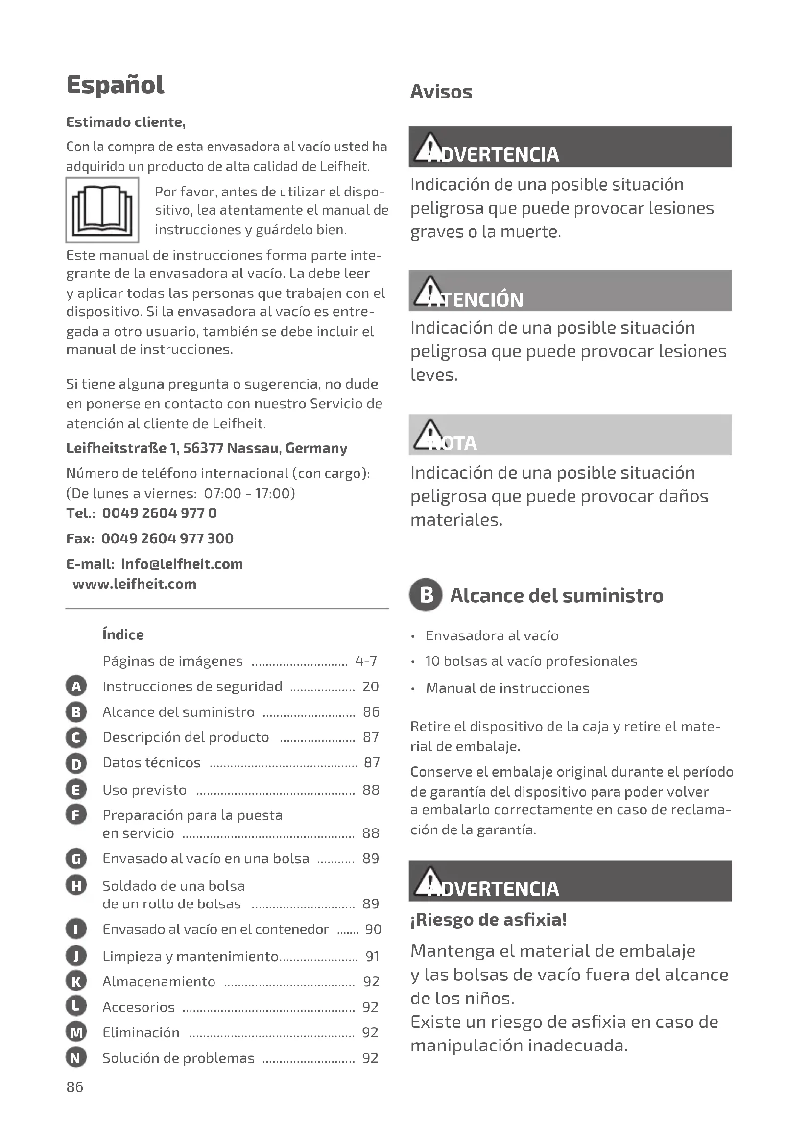 - Ubezpečte sa, že okraj nádoby je dostatočne čistý. Keď sú všetky predtým uvedené situácie vylúčené, kontaktujte príslušné servisné miesto. SK86 Estimado cliente, Con la compra de esta envasadora al vacío usted ha adquirido un producto de alta calidad de Leifheit. Por favor, antes de utilizar el dispo- sitivo, lea atentamente el manual de instrucciones y guárdelo bien. Este manual de instrucciones forma parte inte- grante de la envasadora al vacío. La debe leer y aplicar todas las personas que trabajen con el dispositivo. Si la envasadora al vacío es entre- gada a otro usuario, también se debe incluir el manual de instrucciones. Índice Páginas de imágenes ............................ 4-7 Instrucciones de seguridad ................... 20 Alcance del suministro ........................... 86 Descripción del producto ...................... 87 Datos técnicos ........................................... 87 Uso previsto .............................................. 88 Preparación para la puesta en servicio .................................................. 88 Envasado al vacío en una bolsa ........... 89 Soldado de una bolsa de un rollo de bolsas .............................. 89 Envasado al vacío en el contenedor ....... 90 Limpieza y mantenimiento ....................... 91 Almacenamiento ...................................... 92 Accesorios .................................................. 92 Eliminación ................................................ 92 Solución de problemas ........................... 92 Español ADVERTENCIA ADVERTENCIA Avisos Indicación de una posible situación peligrosa que puede provocar lesiones graves o la muerte. ¡Riesgo de asxia! Mantenga el material de embalaje y las bolsas de vacío fuera del alcance de los niños. Existe un riesgo de asxia en caso de manipulación inadecuada.
