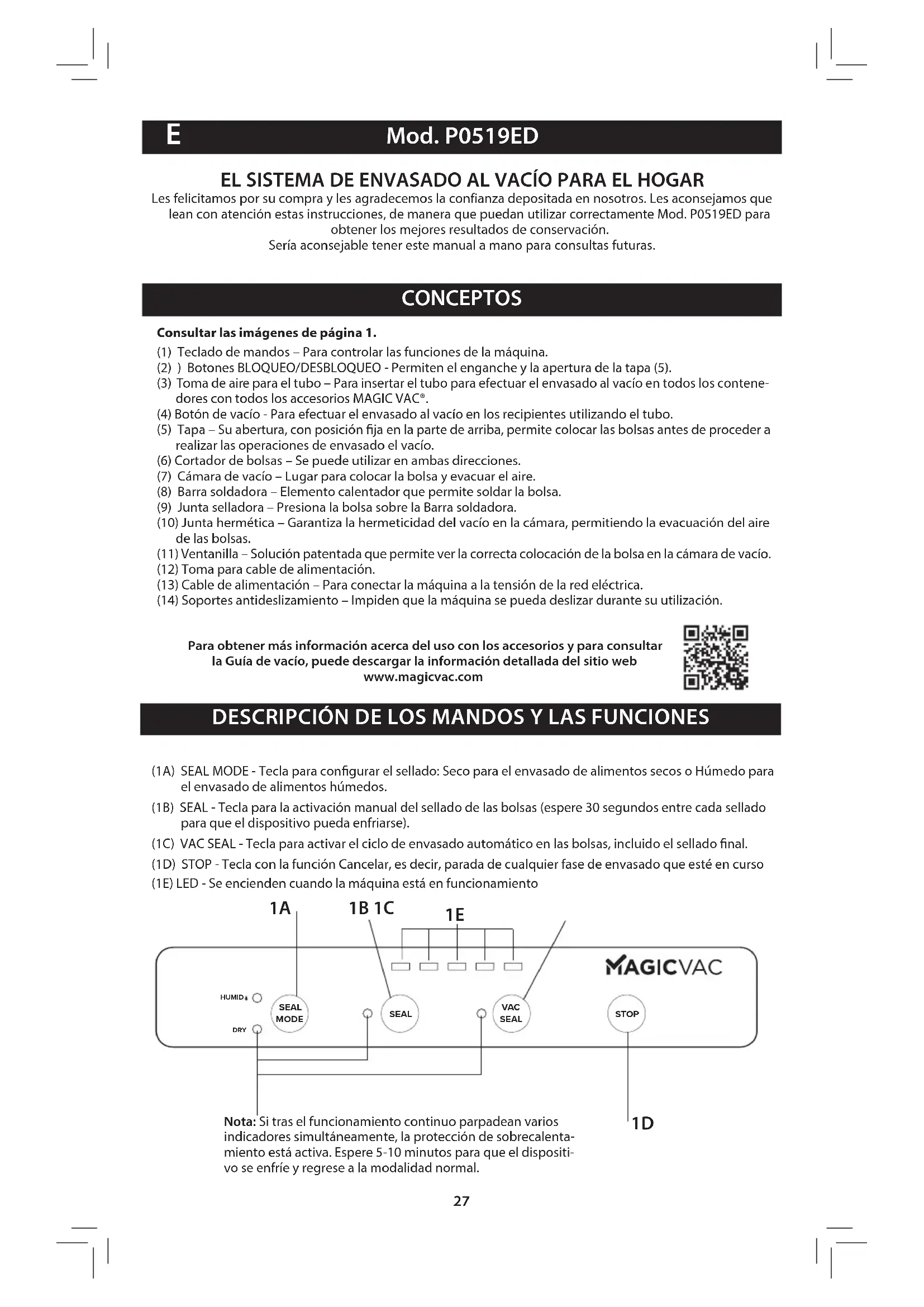 Consultar las imágenes de página 1.(1) Teclado de mandos – Para controlar las funciones de la máquina.(2) ) Botones BLOQUEO/DESBLOQUEO - Permiten el enganche y la apertura de la tapa (5). (3) Toma de aire para el tubo – Para insertar el tubo para efectuar el envasado al vacío en todos los contene- dores con todos los accesorios MAGIC VAC®.(4) Botón de vacío - Para efectuar el envasado al vacío en los recipientes utilizando el tubo. (5) Tapa – Su abertura, con posición ja en la parte de arriba, permite colocar las bolsas antes de proceder a realizar las operaciones de envasado el vacío.(6) Cortador de bolsas – Se puede utilizar en ambas direcciones.(7) Cámara de vacío – Lugar para colocar la bolsa y evacuar el aire.(8) Barra soldadora – Elemento calentador que permite soldar la bolsa.(9) Junta selladora – Presiona la bolsa sobre la Barra soldadora.(10) Junta hermética – Garantiza la hermeticidad del vacío en la cámara, permitiendo la evacuación del aire de las bolsas.(11) Ventanilla – Solución patentada que permite ver la correcta colocación de la bolsa en la cámara de vacío.(12) Toma para cable de alimentación.(13) Cable de alimentación – Para conectar la máquina a la tensión de la red eléctrica.(14) Soportes antideslizamiento – Impiden que la máquina se pueda deslizar durante su utilización.(1A) SEAL MODE - Tecla para congurar el sellado: Seco para el envasado de alimentos secos o Húmedo para el envasado de alimentos húmedos.(1B) SEAL - Tecla para la activación manual del sellado de las bolsas (espere 30 segundos entre cada sellado para que el dispositivo pueda enfriarse).(1C) VAC SEAL - Tecla para activar el ciclo de envasado automático en las bolsas, incluido el sellado nal. (1D) STOP - Tecla con la función Cancelar, es decir, parada de cualquier fase de envasado que esté en curso(1E) LED - Se encienden cuando la máquina está en funcionamiento SEAL SEAL MODE VAC SEAL STOP HUMID DRY