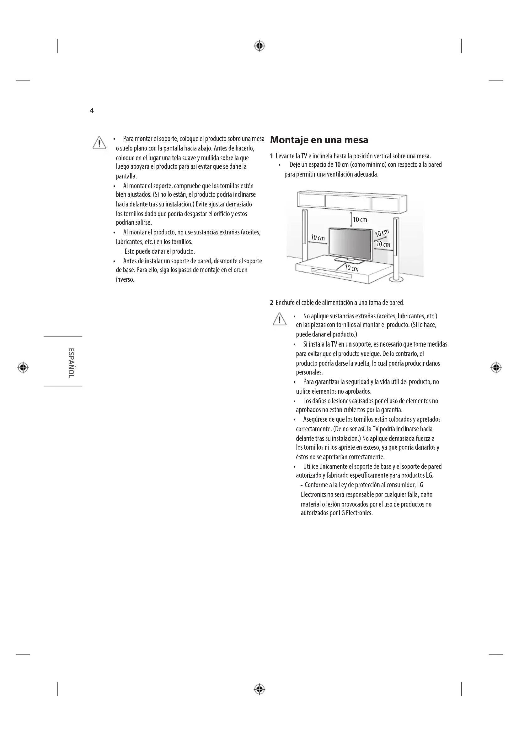 - Utilice únicamente el soporte de base y el soporte de pared autorizado y fabricado específicamente para productos LG. - Conforme a la Ley de protección al consumidor, LG Electronics no será responsable por cualquier falla, daño material o lesión provocados por el uso de productos no autorizados por LG Electronics.5 ESPAÑOL Fijación de la TV sobre un escritorio (En función del modelo) ADVERTENCIA: La TV debe anclarse al escritorio para que no se mueva hacia adelante o hacia atrás, provocando posibles daños personales o al producto. Tipo A 4 tornillos (No suministrado con la TV) Escritorio Soporte