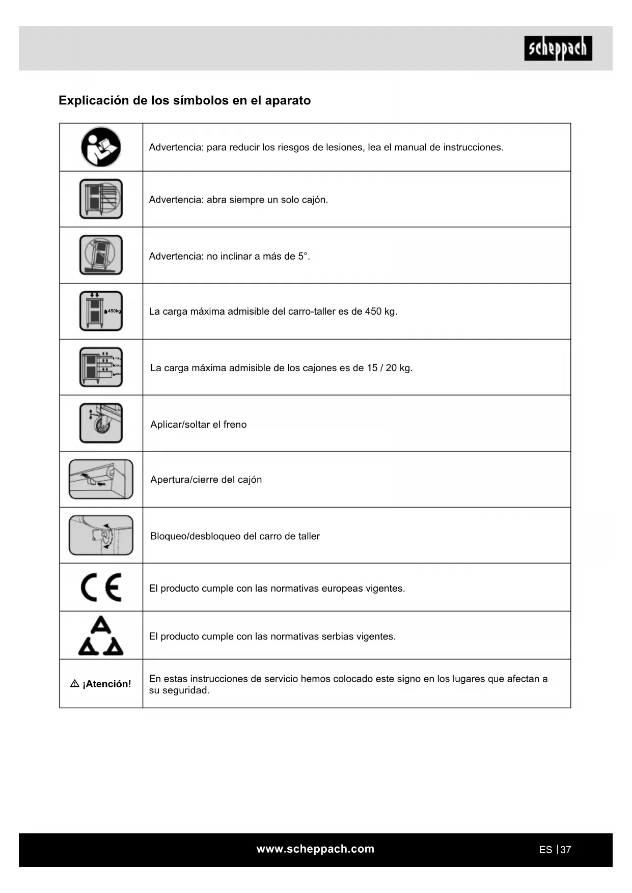Explicación de los símbolos en el aparato Advertencia: para reducir los riesgos de lesiones, lea el manual de instrucciones. Advertencia: abra siempre un solo cajón. Advertencia: no inclinar a más de 5°. 450kg La carga máxima admisible del carro-taller es de 450 kg. 15kg 20kg 20kg La carga máxima admisible de los cajones es de 15 / 20 kg. Aplicar/soltar el freno Apertura/cierre del cajón Bloqueo/desbloqueo del carro de taller El producto cumple con las normativas europeas vigentes. El producto cumple con las normativas serbias vigentes. m ¡Atención! En estas instrucciones de servicio hemos colocado este signo en los lugares que afectan a su seguridad.www.scheppach.com