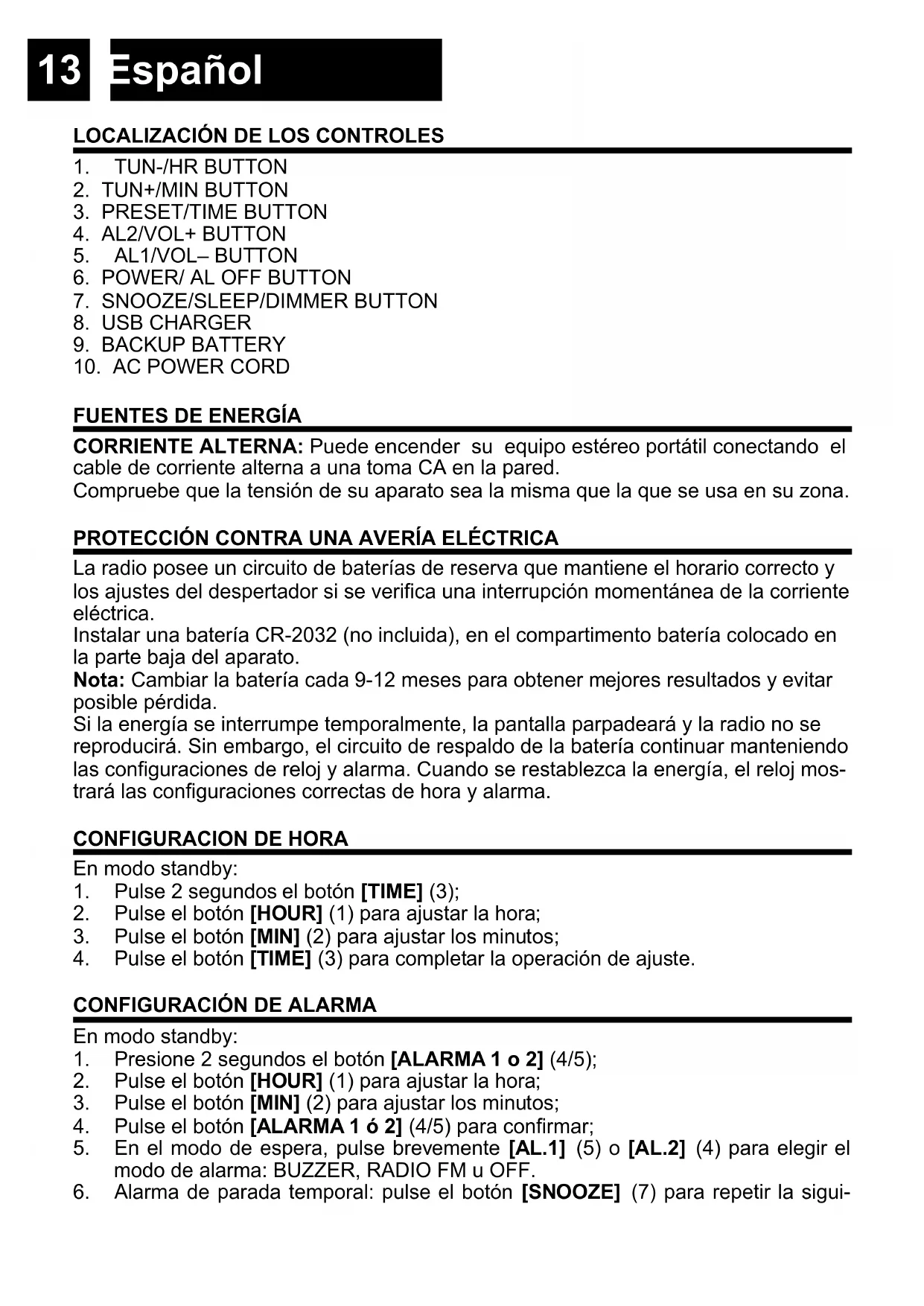 CORRIENTE ALTERNA: Puede encender su equipo estéreo portátil conectando el cable de corriente alterna a una toma CA en la pared. Compruebe que la tensión de su aparato sea la misma que la que se usa en su zona. PROTECCIÓN CONTRA UNA AVERÍA ELÉCTRICA La radio posee un circuito de baterías de reserva que mantiene el horario correcto y los ajustes del despertador si se verifica una interrupción momentánea de la corriente eléctrica. Instalar una batería CR-2032 (no incluida), en el compartimento batería colocado en la parte baja del aparato. Nota: Cambiar la batería cada 9-12 meses para obtener mejores resultados y evitar posible pérdida. Si la energía se interrumpe temporalmente, la pantalla parpadeará y la radio no se reproducirá. Sin embargo, el circuito de respaldo de la batería continuar manteniendo las configuraciones de reloj y alarma. Cuando se restablezca la energía, el reloj mos- trará las configuraciones correctas de hora y alarma.