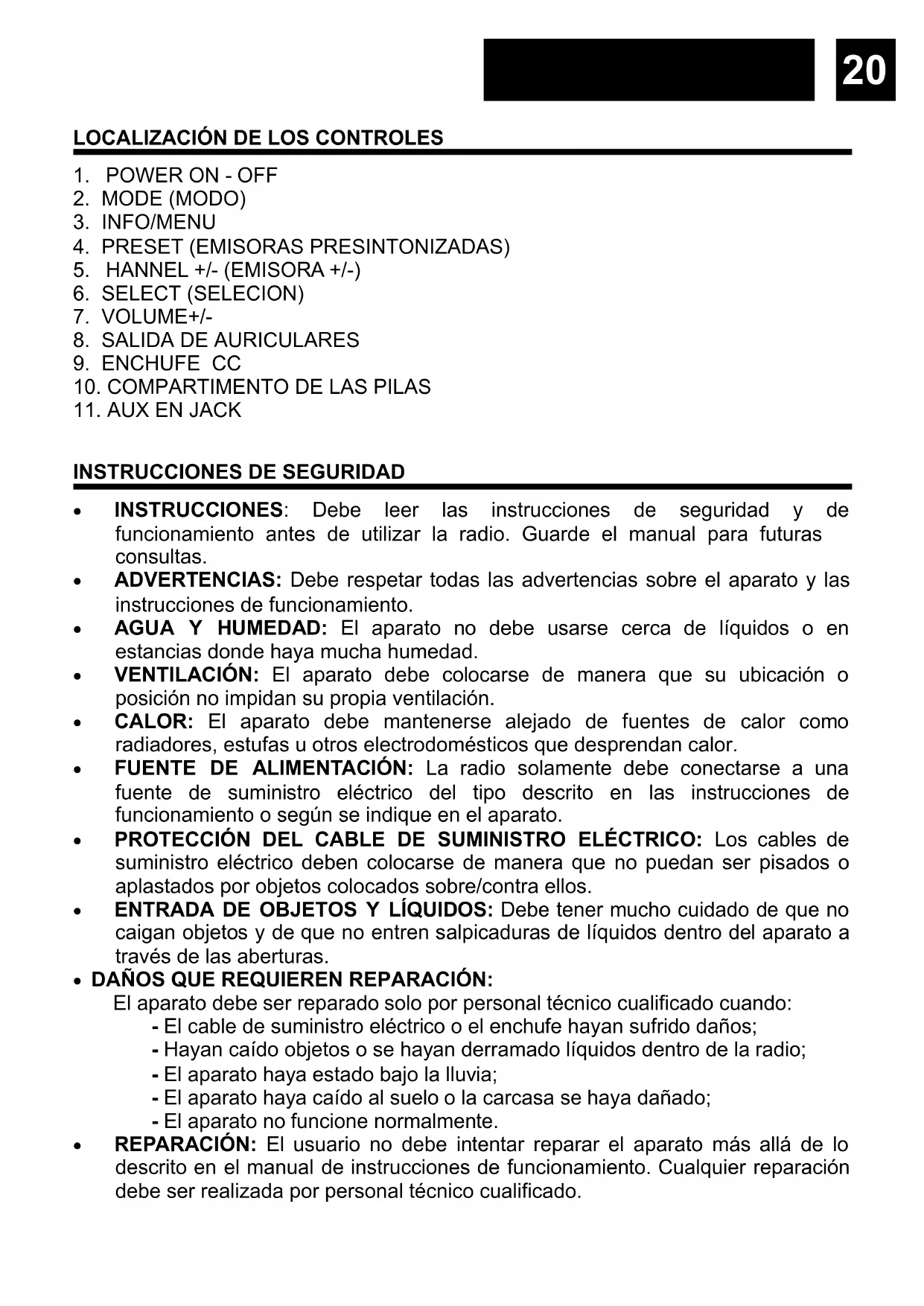 - INSTRUCCIONES: Debe leer las instrucciones de seguridad y de funcionamiento antes de utilizar la radio. Guarde el manual para futuras consultas.