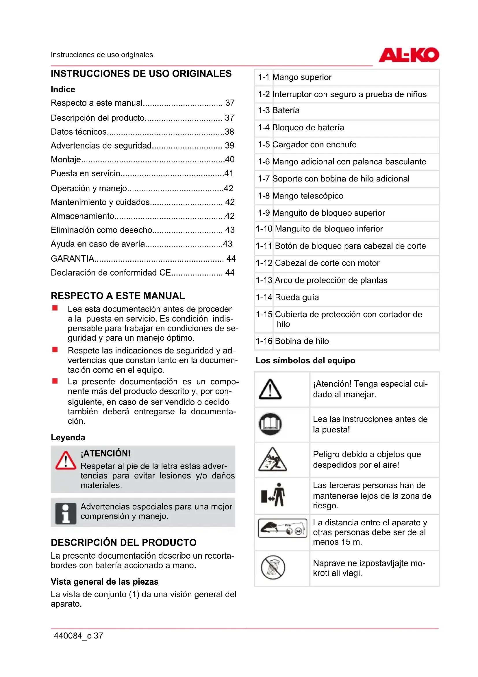 La presente documentación describe un recorta- bordes con batería accionado a mano. Vista general de las piezas La vista de conjunto (1) da una visión general del aparato. 1-1 Mango superior 1-2 Interruptor con seguro a prueba de niños 1-3 Batería 1-4 Bloqueo de batería 1-5 Cargador con enchufe 1-6 Mango adicional con palanca basculante 1-7 Soporte con bobina de hilo adicional 1-8 Mango telescópico 1-9 Manguito de bloqueo superior 1-10 Manguito de bloqueo inferior 1-11 Botón de bloqueo para cabezal de corte 1-12 Cabezal de corte con motor 1-13 Arco de protección de plantas 1-14 Rueda guía 1-15 Cubierta de protección con cortador de hilo 1-16 Bobina de hilo Los símbolos del equipo ¡Atención! Tenga especial cui- dado al manejar. Lea las instrucciones antes de la puesta! Peligro debido a objetos que despedidos por el aire! Las terceras personas han de mantenerse lejos de la zona de riesgo. La distancia entre el aparato y otras personas debe ser de al menos 15 m. Naprave ne izpostavljajte mo- kroti ali vlagi.es Descripción del producto 38 GTLi 18V Llevar gafas protectoras, casco de seguridad y protección para los oídos. Retire la batería antes de cual- quier ajuste o limpieza del equipo, se hace o cuando el dispositivo se deja desatendida durante un tiempo. Mango telescópico ajustable El recortabordes está equipado con un mango telescópico ajustable. De este modo, el aparato se puede ajustar a las distintas estaturas de los usuarios y la cabeza de motor se puede girar. Cabezal de corte giratorio y ajustable El GT Li18V está equipado con un cabezal de corte giratorio y ajustable en ángulo. Sistema automático de pulsación En el cabezal de hilo se ha incorporado un sis- tema automático de pulsación (8-4) para extender el hilo de corte con el motor en marcha. Dispositivos de seguridad y de protección Seguro a prueba de niños El orificio (5 mm) en el guardamotor está previsto para un candado*. Este candado impide el arran- que involuntario del aparato. *No se incluye en el volumen de suministro ¡ATENCIÓN! ¡Peligro de lesiones! No se deben desactivar los dispositivos de seguridad y de protección. Uso acorde a los fines establecidos Este aparato está previsto para segar un piso de césped en el sector privado. Todo otra utilización distinta a éste se considera no conforme a lo pre- visto. El uso de este aparato no es adecuado para personas (incluidos niños) con limitaciones físicas, sensoriales o mentales, o con falta de experiencia o conocimientos, a no ser que estén bajo la supervisión de una persona re- sponsable de su seguridad o hayan recibido de ella instrucciones sobre el modo de fun- cionamiento del aparato. Se debe vigilar a los niños para que no jueguen con el aparato. ¡ATENCIÓN! El aparato no debe utilizarse en la indus- tria.